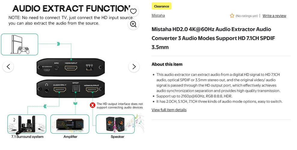 >Have 2023 TV>Have 2005 5.1 AV receiver (HTIB shit)>TV can't pass 5.1 PCM audio through optical output>Receiver can't read/pass 4k video>Too poor to replace speakersWhat's the cheapest device to split/pass PCM audio over HDMI? Does such a device exist? Can I get it in one device, or could a series of splitter and downscaler work?Amazon and Aliexpress only has stuff $60+Do you suppose this could work? Lol, no reviewshttps://www.walmart.ca/en/ip/seort/1JKX4PTMF61Q?selectedSellerId=102950927