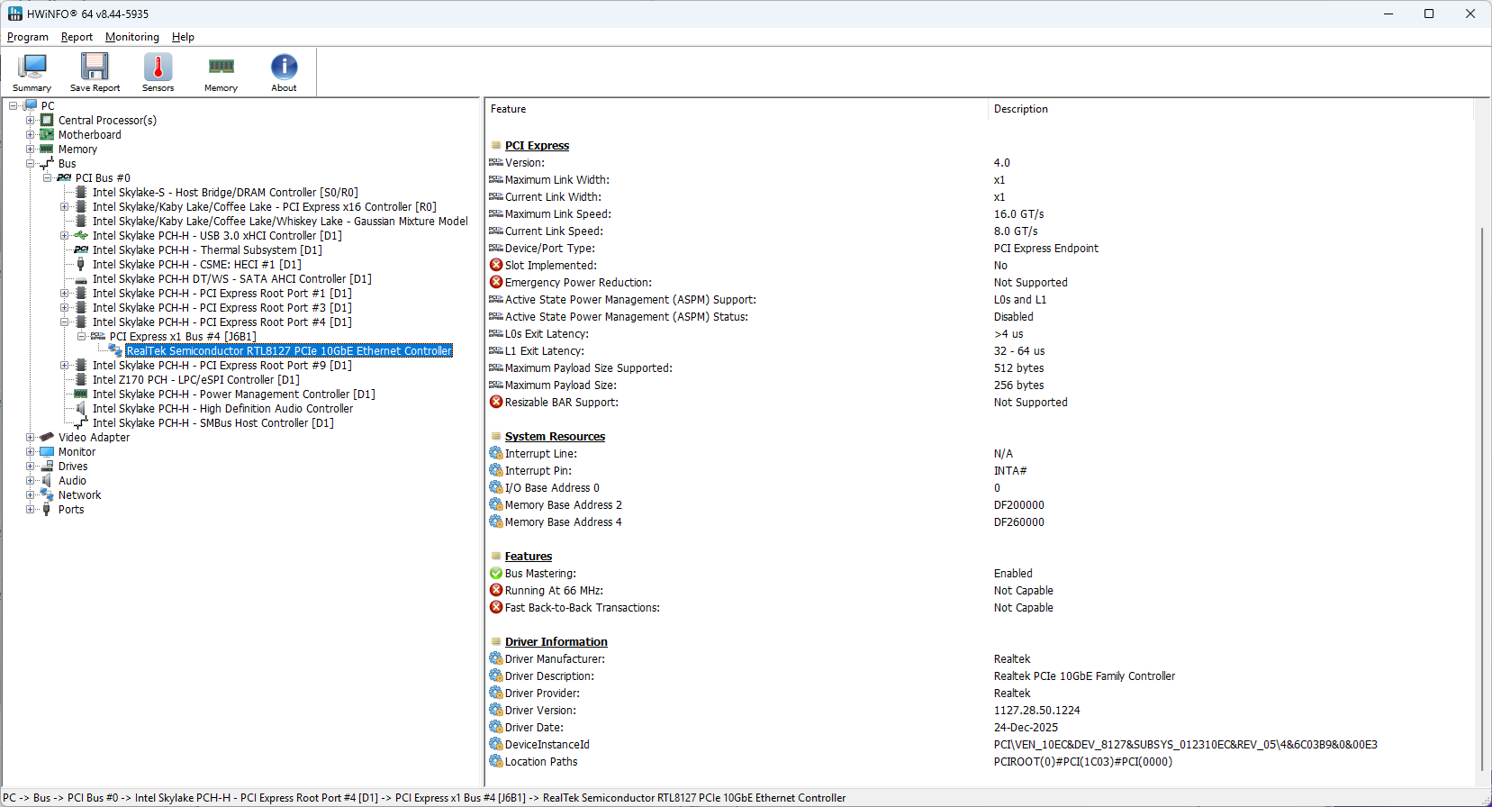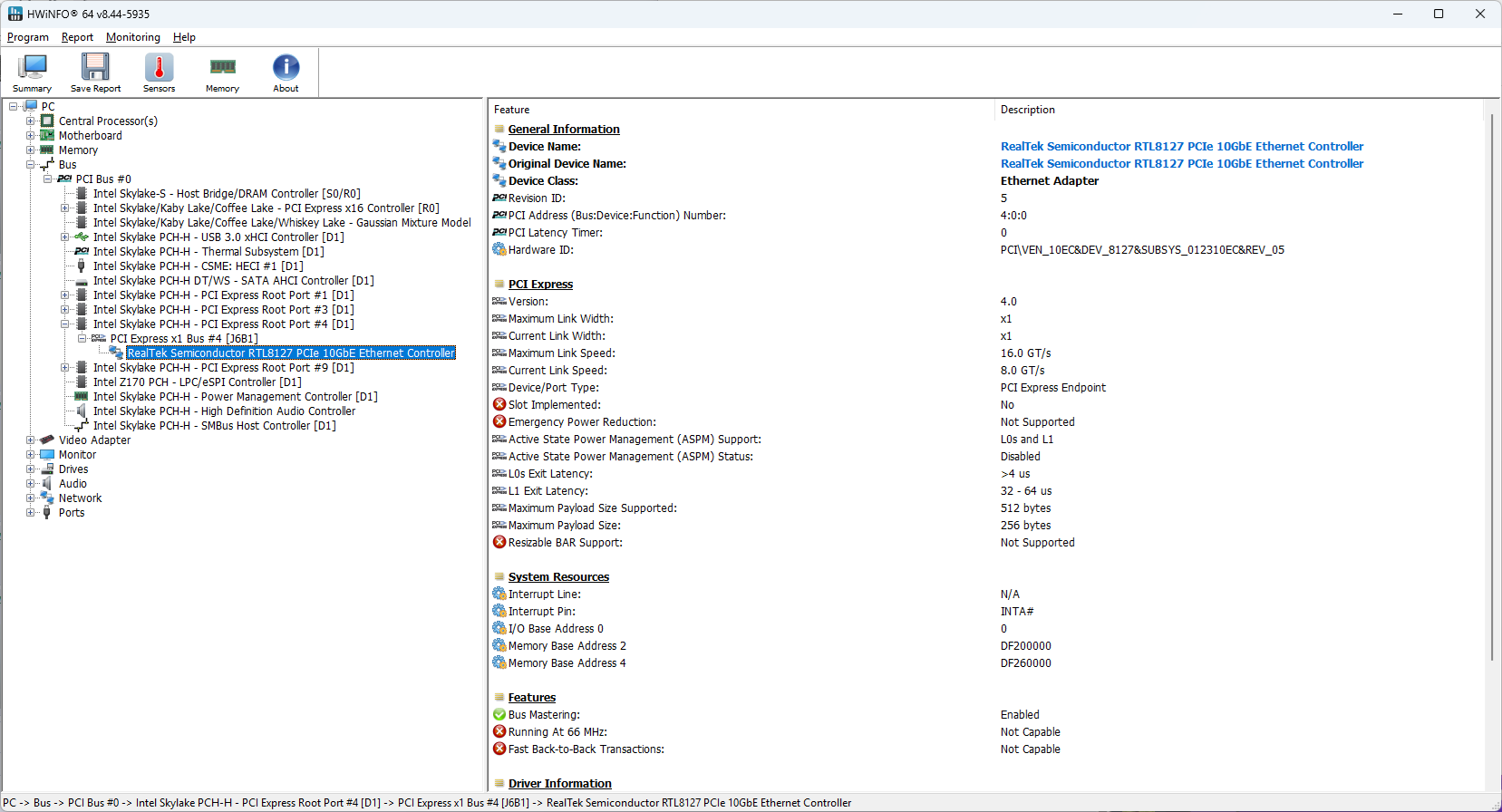 >>108331606The card works just fine on Windows 11. This card replaced a TP-Link TG-3468 v2 NIC which was based on RTL8168E. I was working fine, but only with the NDIS driver because they didn't port RTL8168E driver to NetAdapterCx. Could be some technical reason why it was not possible, but oh well. It served me well, and I will keep it in case I need it for another older machine.All I did was I uninstalled the NDIS driver that Realtek provided. The card works just fine with that as well. After I uninstalled there's an old driver that comes with Windows 11, which doesn't support the RTL8127. I do get a link with that, but only 2.5GbE.You have the right driver if in Device Manager you get this: Realtek PCIe 10GbE Family ControllerHere's some hardware IDs, basically it uses standard Realtek PID and VID: PCI\VEN_10EC&DEV_8127&SUBSYS_012310EC&REV_05It doesn't run hot and heatsink is only warm to the touch, so the power consumption is as advertised.