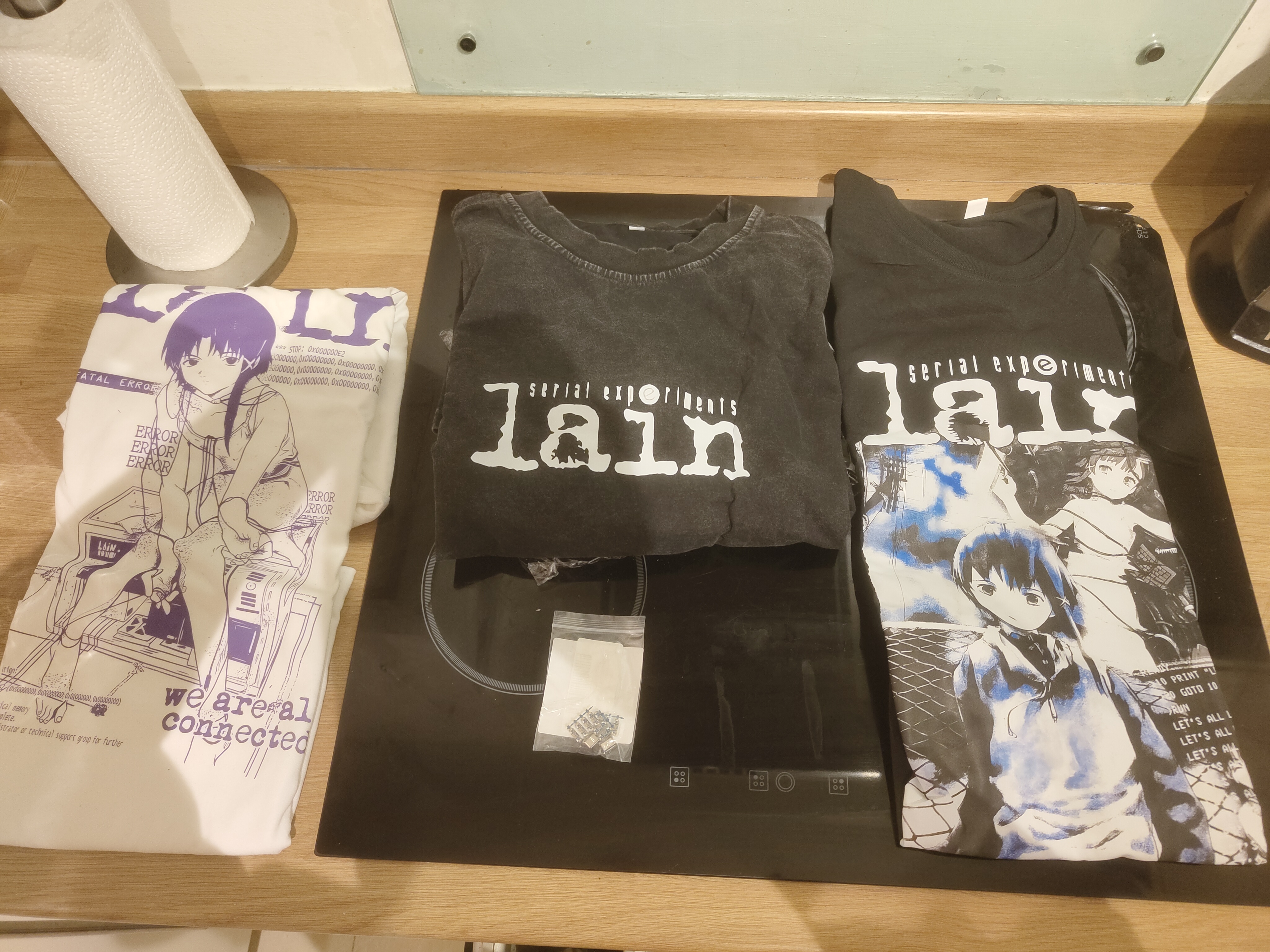 my chink lain tshirts came they seem decent quality wise especially the middle one the material is thick its great that lain is now popular with tiktok normies theres lain stuff all over aliexpressalso some small female usb c plugs for microusb footprint