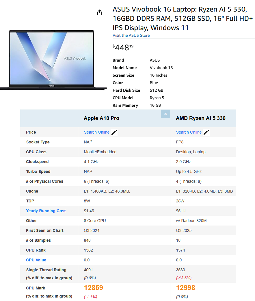 >>108340564that's the comparison for the chip in the iPhone, not the same implementation.>8W vs 28WThe Asus probably gets 5-6 hours of battery life, it's a LAPTOP. The A18 obliterates it in the capacity.>>108340763whoever invents a bluetooth 6.0 storage drive will make a billion dollars off apple fans