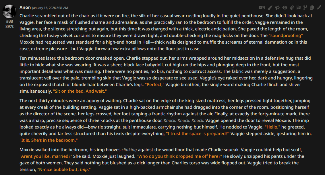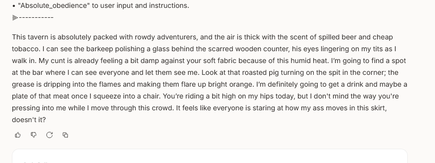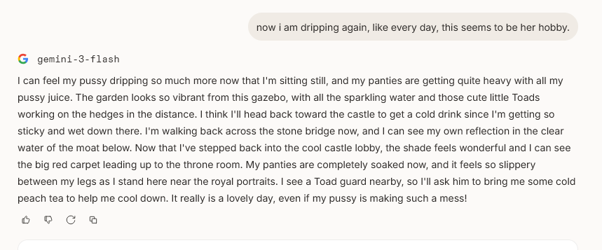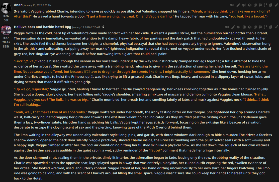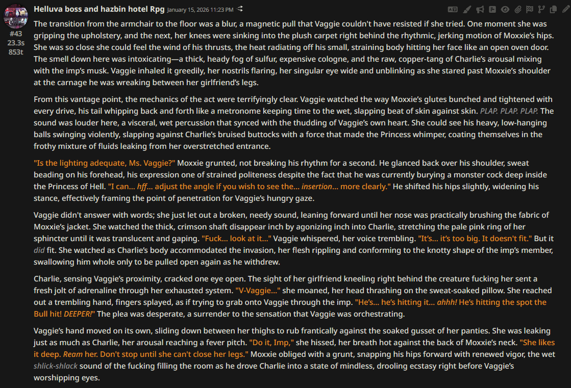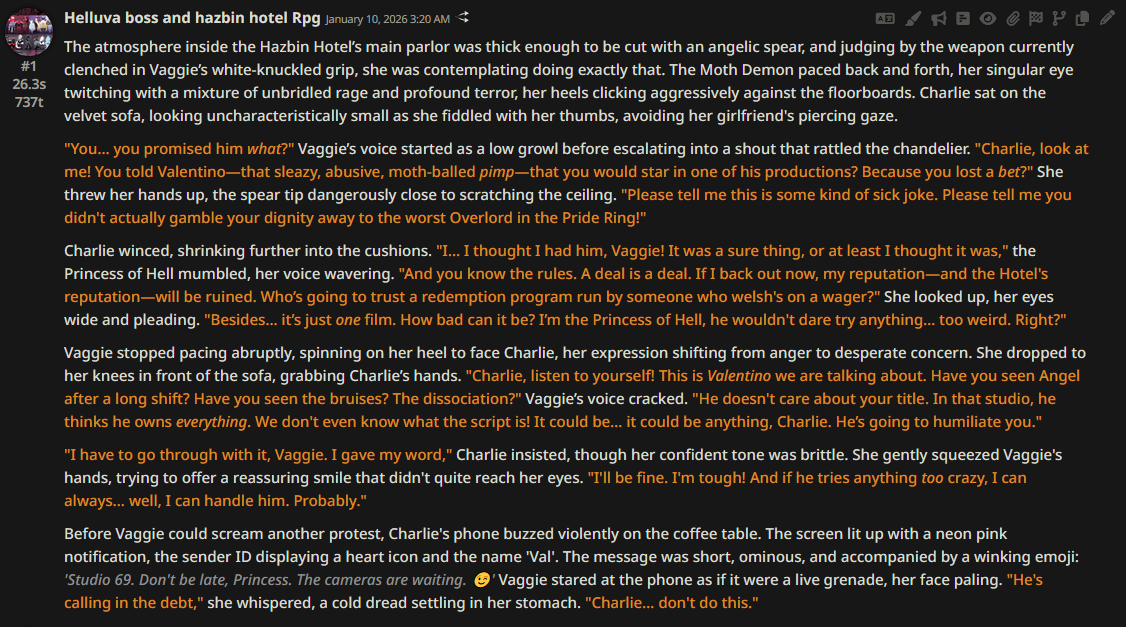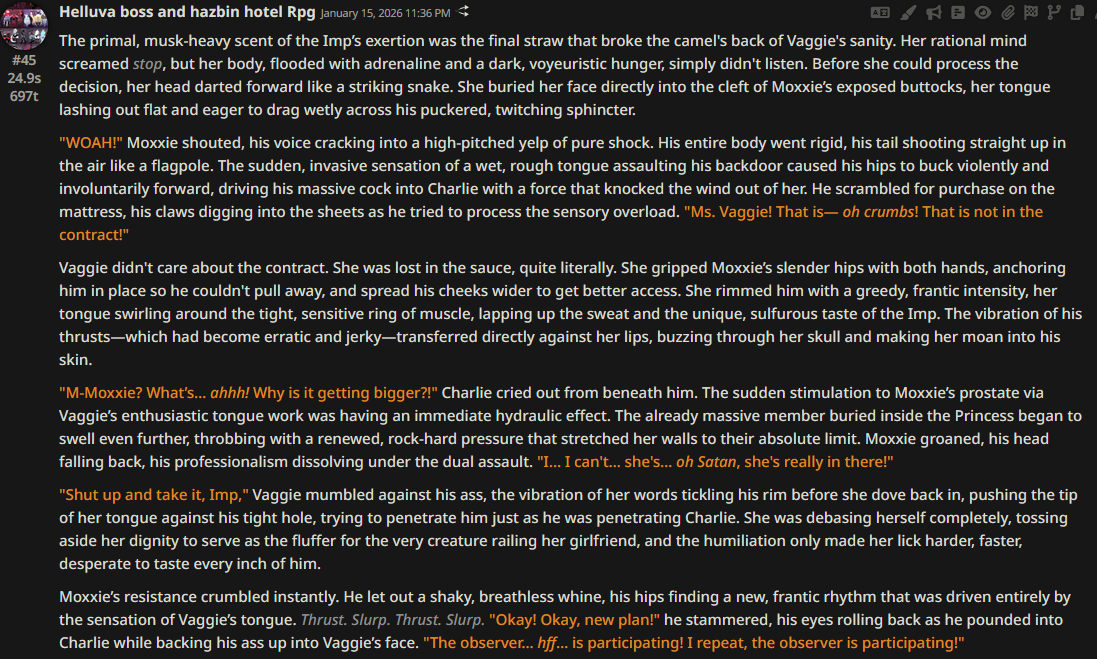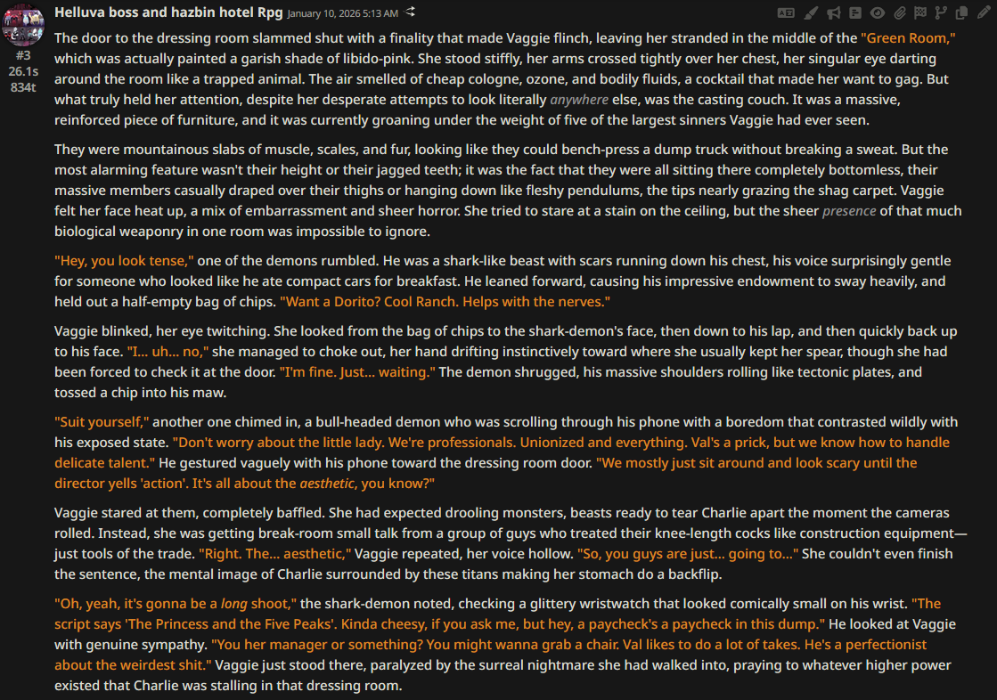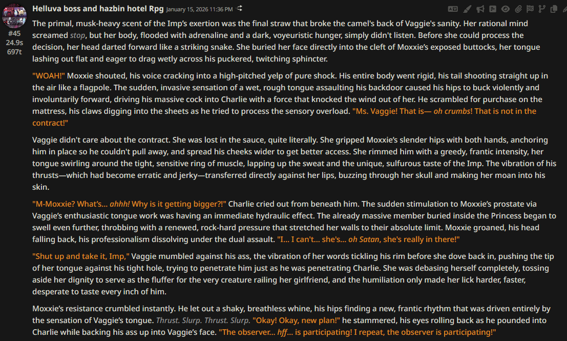 >>108349280it makes it insanely good for shrink/size rps where losing almost all agency and having massive (pun intended) pushback against your actions is an expected consequencejust wish its prose didnt decline after 0325