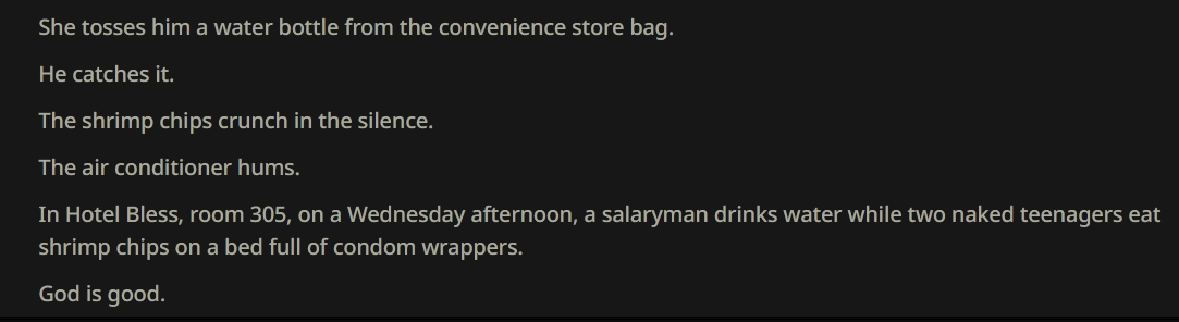 >>108349117>repetitive prose full of eslisms*