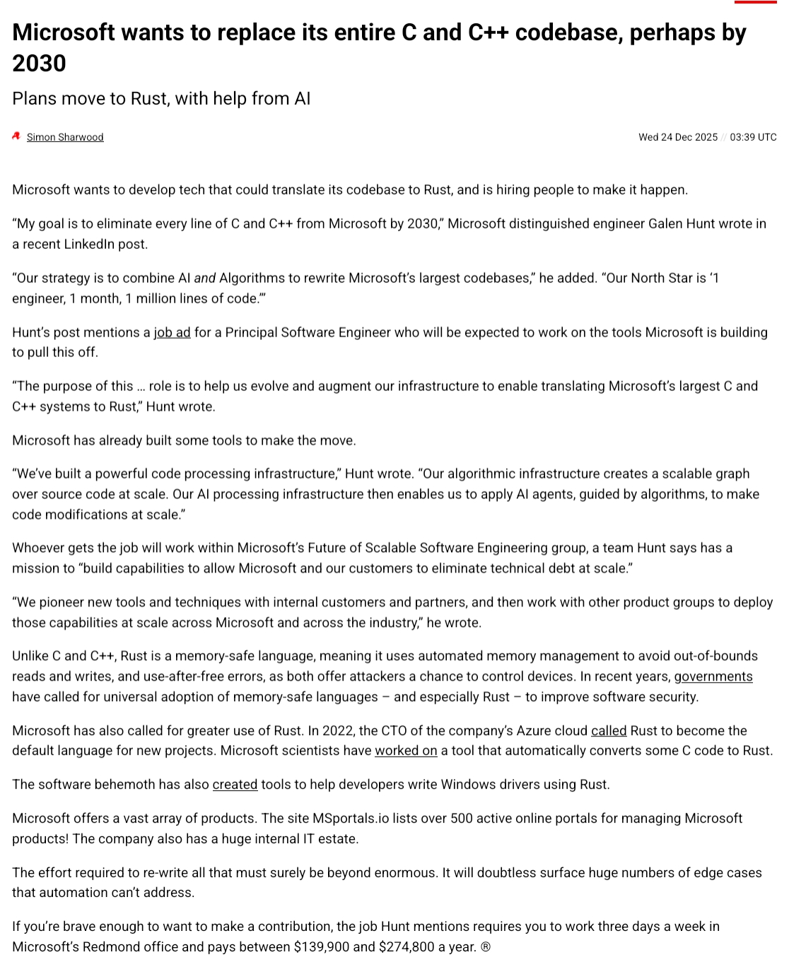 >>108345598>Microsoft to replace all C/C++ code with rust using AI.No they are not.It was stated by Microsoft that this is a fake news like 2 days after people started talking about it. Why do retards keep talking about it 2 months afterwards?
