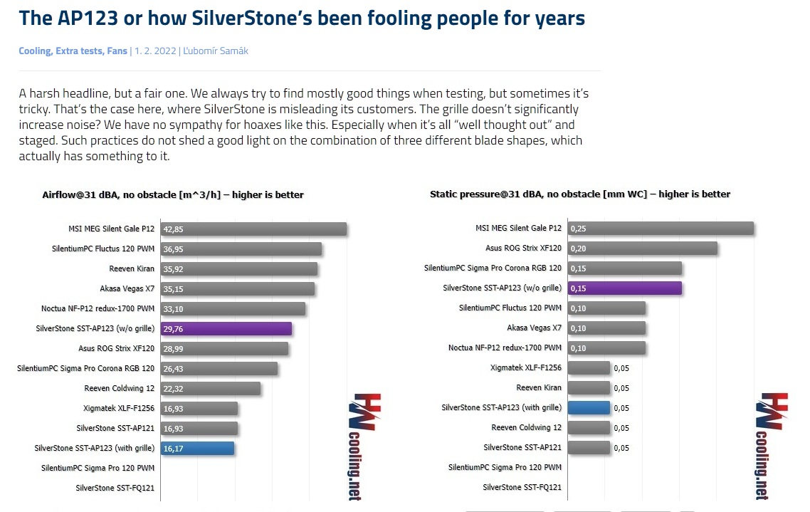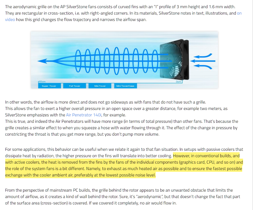 >>108358115I'm skeptical about those grills too but those stars are clickbait bullshit.It's like someone adds a turbo to their car's engine to get more top speed and them someone says it's dumb because it increases noise and fuel consumption "slam dunk, turbo's do not work!!!!!", ignoring the top speed which was the whole point.If they were serious they would measure "air penetration" (air movement in the middle of the case) not air flow or static pressure.