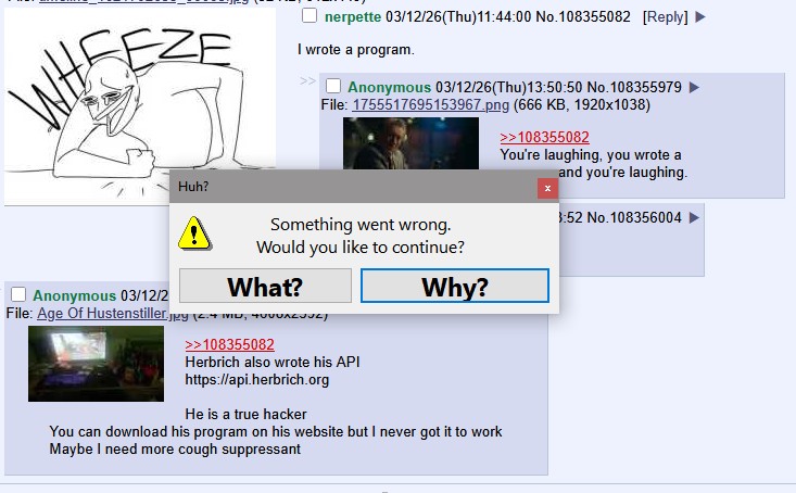 >>108355082Herbrich also wrote his APIhttps://api.herbrich.orgHe is a true hackerYou can download his program on his website but I never got it to workMaybe I need more cough suppressant