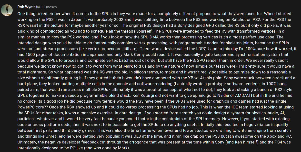 >>108359281>>108359687The idea was to have the cell PPE be the main core, and the SPE act like the PS2 VU0/VU1 - run its own microcode and do complex vertex transforms, same as vertex shaders but more flexible, so a bit like CUDA like you said. This was to be paired up with a super fast rasterizer called RS, that would presort the SPE vertex output into the correct order for drawing, and then draw everything in parallel. Essentially it would be a souped up PS2 same way as PS2 was a souped up PS1.The RS was too large and Toshiba couldn't fab it, so they tried using a 2nd Cell to do software rendering but this was stupid slow. They had no choice but to go with a nVidia chip, otherwise they would not have been able to launch at all. It's why the GPU in the PS3 makes no sense architecturally, the GPU is completely different from the rest of the hardware and it looks bolted on in the middle of the Cell bus. It's not even on the motherboard, it's on its own interposer, which is then soldered to the motherboard. And you have dumb ass restrictions like few megabyte/s transfer speeds for one of the chips to the other but 22GB/s the other way around. And the split RAM/VRAM pools.And the reason it cost $599 (in 2006 dollars, so like $1200 today) is because nVidia knew that Sony was stuck and they could ask any price whatsoever from them.Adding all the extra shit like the SD card reader was just to justify the machine as a luxury console. They removed all the extra features in later revisions including the PS2 compatibility.