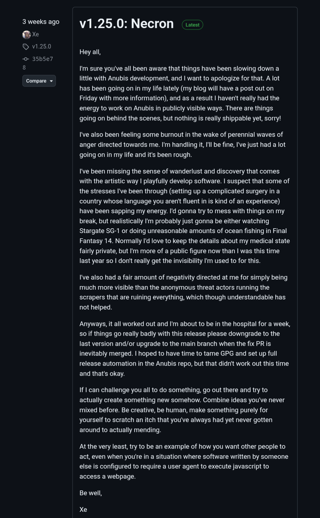 Do you consider the health of developer before adopting their software?>I suspect that some of the stresses I've been through (setting up a complicated surgery in a country whose language you aren't fluent in is kind of an experience) have been sapping my energy.>Anyways, it all worked out and I'm about to be in the hospital for a weekKinda a funny thing to call "worked out"