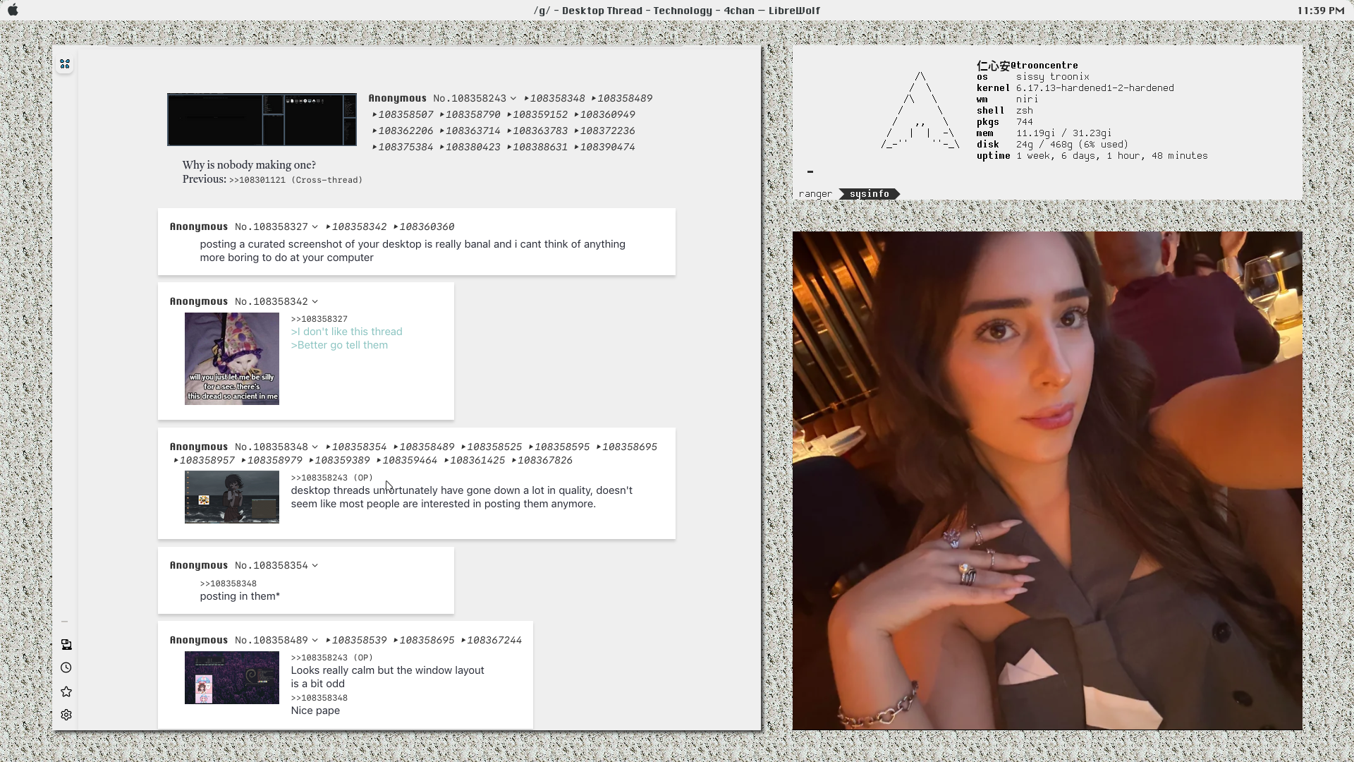 it is time i admit that i have fallen on even harder times>>108399013that's what i mean when i say good themes have died since mid 2010s, this is lost art now because everyone is busy making flatshit slop>>108399373like your new panel arrangement>>108399435>basiliskmy condolences, we both suffer together on this browser. at least you picked out alternatives, i liked none of the alternatives.>>108399449o great xorg schizo, show this heathen how it's done>>108400280you made me remember angry birds used to be on pc, good times>>108406586finally someone shares my taste in women>>108406588tried changing blur settings for the windows?