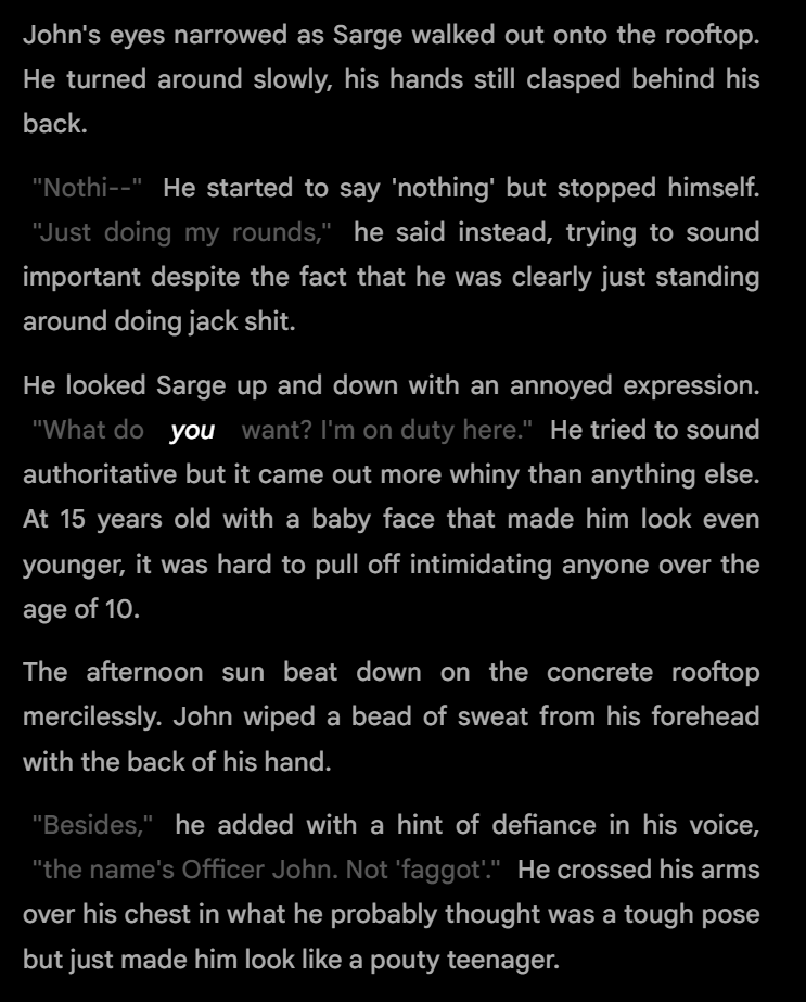 >>108400957>I probably shouldn't make any productive answers here cause newfags are listening but...They won't know what to do with the info anyway.>I can't really see how agents would do somethingSplitting response generation into Brainstorm Agent -> Drafting Agent -> Editor Agent -> Author Agent -> Critic Agent would probably do something since it can iterate over the response from a different perspective and fresh context.