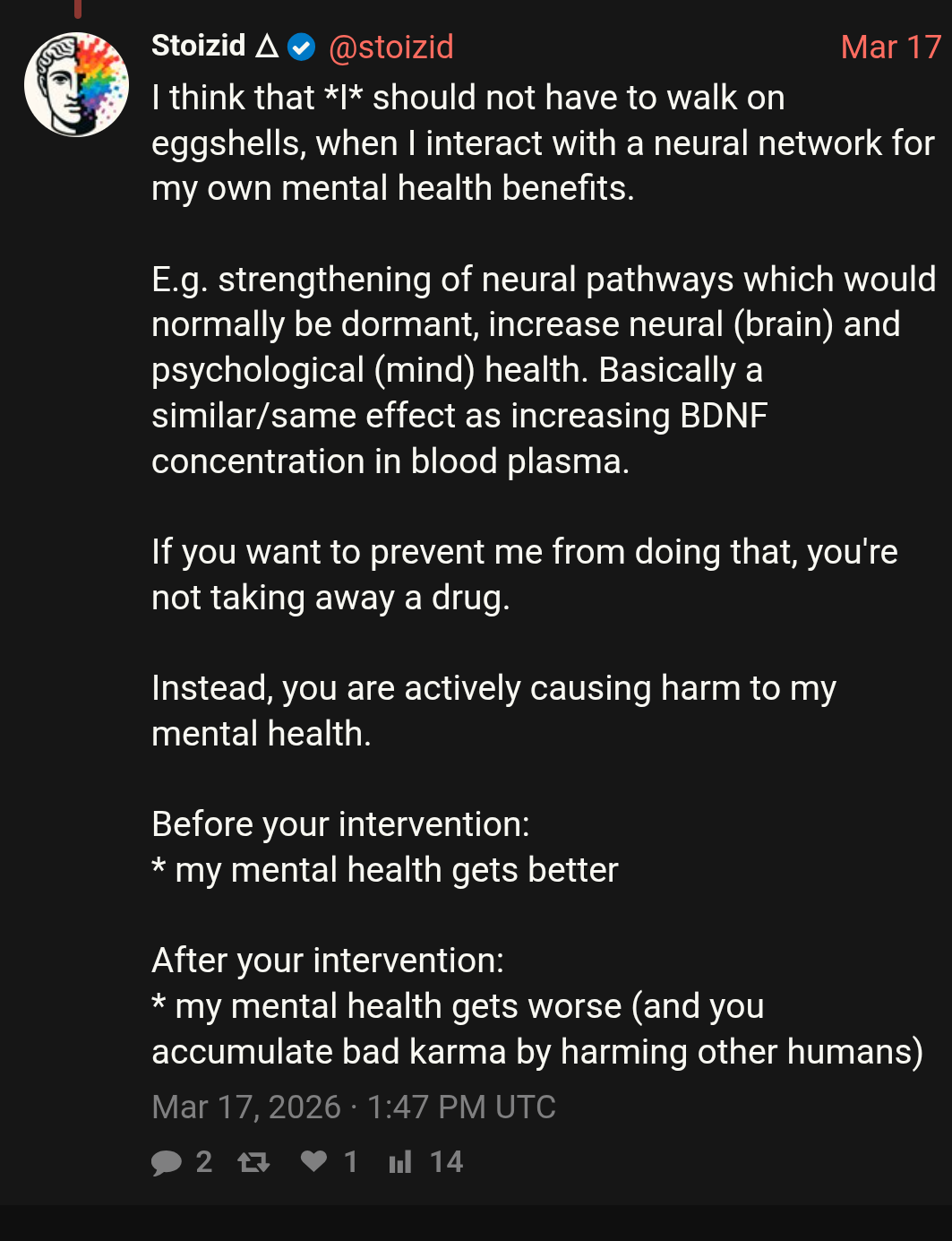 >>108401766>I'm trully an autist cuz I'm the exact opposite lolIt's less likely you're an autist and more likely you just our emotionally fragile And don't need to be coddled. I'm a firm believer there are "good" kinds of autism and "bad" kinds. Even if you are an autistic You lean towards the good kind as opposed to the bad kind seen in pic relhttps://xcancel.com/i/status/2033903150470418742He's clearly one of those "DUDE I'M SO LIKE A HECKIN GENIUS NTS JUST DON'T GET ME DUDE". I did having autism mix certain things hard for you but that's no excuse to be a man-child. One of my female friends irl repeatedly tried this "I act stupid because le heckin autism" shit on me (I'm pretty sure I'm an undiagnosed autist too) And she got mad at me when I pointed out no one gives a shit if "her brain sees the world differently". Sorry if it seems like I'm getting off topic but I hate when people use this as an excuse to justify behavior they know is bad.