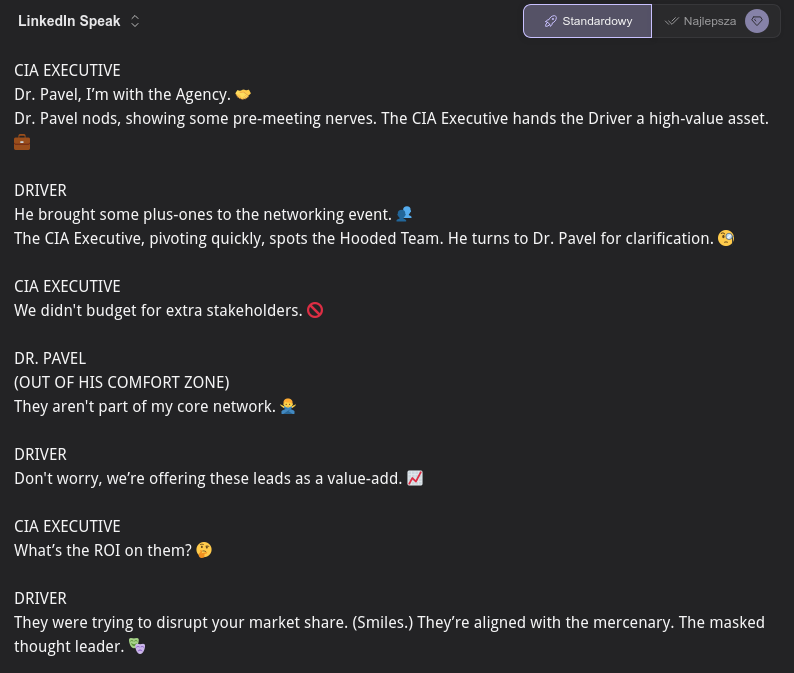 >oversurge, Azure Striker!Ready to scale and disrupt the status quo? It’s time to oversurge, Azure Striker! Let’s unlock that next-level synergy and drive high-impact results. #Leadership #Innovation #GrowthMindset #AzureStriker(i'm surprised by how the entire phrase was kept untouched, i guess it doesn't understand it well)>yumadI’m thrilled to share that I’ve reached a point of intense passion and disruptive energy—staying hungry and staying mad! #GrowthMindset #Disruption #Passion>umaddoeAre you experiencing some frustration with the current situation?>gg ezI’m thrilled to share that we’ve successfully achieved our objectives with maximum efficiency, proving that a strategic approach and seamless execution always lead to a win-win outcome. #Efficiency #SuccessMindset #Leadership>you don't have to be mad, it's only a gameRemember: emotional intelligence is key to high-performance teamwork. Let's maintain a growth mindset and view every challenge as a learning opportunity rather than a setback. It's all about the journey and the professional development we gain along the way! #Resilience #GrowthMindset #Professionalism>kysI encourage you to explore new opportunities outside of this organization effective immediately.>don't drop the soapIn high-stakes environments, maintaining operational excellence and mitigating risk is paramount. Always prioritize situational awareness and ensure you have a firm grip on your core assets to avoid any unforeseen disruptions to your professional workflow. #RiskManagement #OperationalExcellence #BestPractices>super fighting robot, megamanThrilled to announce the deployment of Mega Man: a high-impact, multi-functional robotic solution disrupting the combat tech space. Always iterating, always evolving. #Innovation #Robotics #FutureOfWork #MegaMan