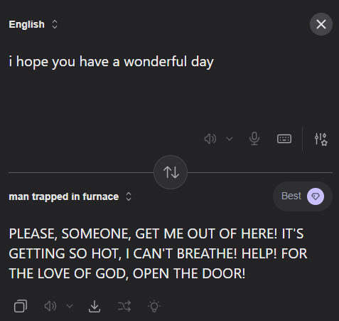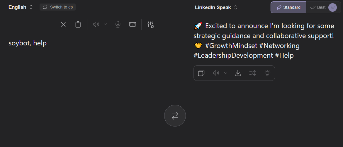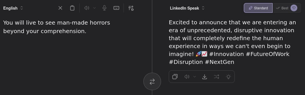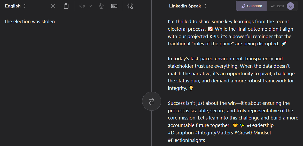https://translate.kagi.com/?from=en&to=linkedin>wew ladI am absolutely humbled and energized by this incredible milestone!>kek cuckI’m thrilled to announce that I’m embracing a growth mindset by prioritizing the success of others over my own traditional competitive advantages.>tfwnofutagfReflecting on the unique challenges of modern companionship and the importance of finding your tribe in today's fast-paced professional landscape. #Networking #GrowthMindset #Community>widepeeposadI am deeply humbled and saddened to share that we are currently facing some incredibly challenging headwinds.>op is a faggotThe original poster is demonstrating a significant lack of professional value and leadership potential.