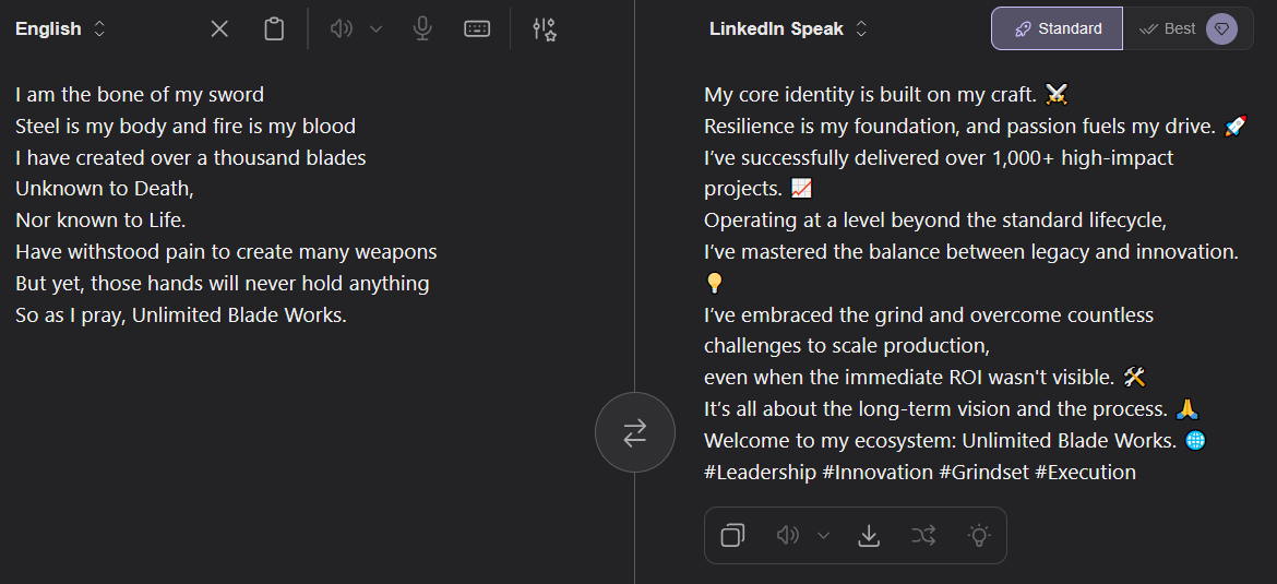 >if i don't do it, who will? dragon fistLeadership is about taking ownership when no one else will. If I don't step up and drive results, who will? It’s all about that "Dragon Fist" mentality—striking with precision, power, and unwavering focus to break through barriers. #Leadership #Ownership #GrowthMindset #Execution>kakarot, you're number 1Kakarot, I’m thrilled to announce that you’ve officially reached the #1 spot! Your relentless work ethic and commitment to growth are truly inspiring. It’s a masterclass in leadership and high performance. Let’s keep crushing those goals! #Leadership #GrowthMindset #NumberOne #Success>i will never forgive you, freeza!I’ve recently had to make the difficult decision to permanently sunset our partnership, Freeza. While we’ve had a long journey together, your recent actions simply don't align with my core values or the growth-mindset culture I’m building. Moving forward, I’m prioritizing radical accountability and surrounding myself with high-integrity stakeholders. Excited to see what this next chapter of independence brings! #Leadership #Accountability #GrowthMindset #MovingForward>special beam cannonLeveraging a high-impact, precision-targeted strategic initiative to disrupt the landscape and achieve breakthrough results. #StrategicExecution #HighImpactSolutions #PrecisionLeadership>the horror won't endI’m thrilled to share that we are currently navigating a period of sustained, high-intensity challenges. It’s a unique opportunity to lean into resilience and embrace a long-term growth mindset as we redefine what’s possible in a persistent disruption landscape. #Resilience #GrowthMindset #Leadership #ContinuousImprovement