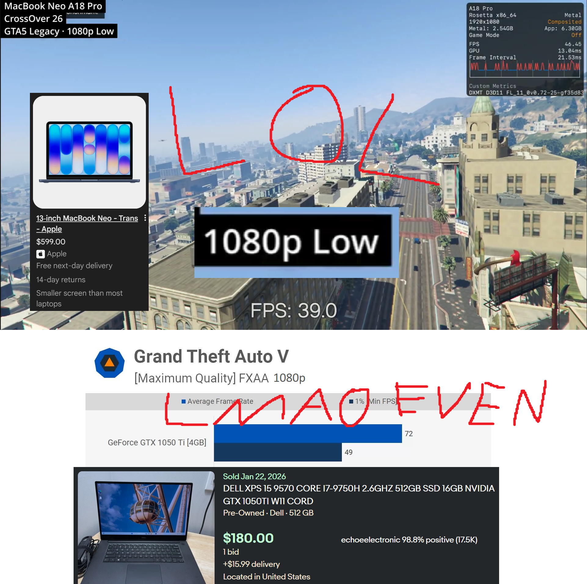 >>108407227This isn't made for gamers. It's made for poor Apple fans.>>108407234>Is the M1 to M5 such a big jumpM5 is basically 2x M1 performance. Macbook Neo uses A18 Pro which is roughly as powerful as the M1, but throttles really hard because Apple didn't add $0.2 worth of cooling material on it. It's not worth buying over the M4 and if you're on a tight budget it's better to just buy the M1 or M2 anyway (or a Windows laptop like a normal person).