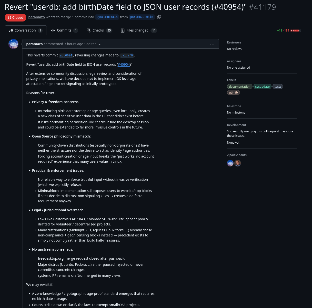 >>108407036Is it really that bad? It gives compliant websites and apps something they can query to get an age range, and you just write whatever you want there as root without giving anything sensitive to anybody. It also gives a way to limit exposure to age-inappropriate material if you have an actual kid, just set it up with their approximate age and don't put them in sudoers, though it's not a substitute for proper parenting of course.