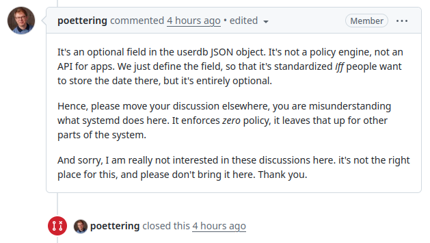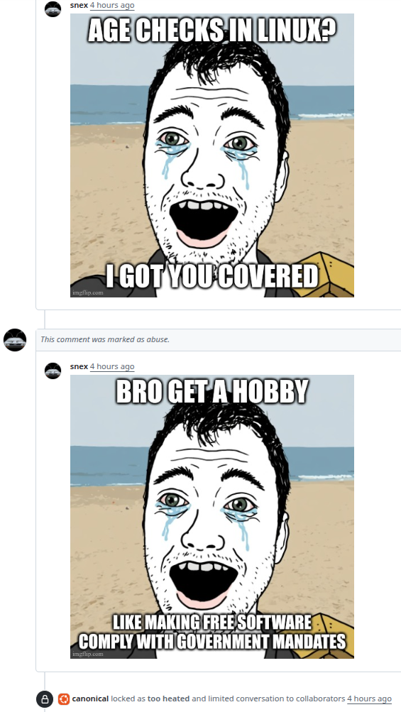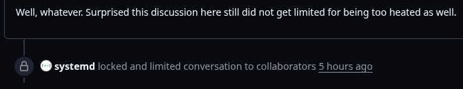 >>108407105Reminds me how gnome generally attacks their own user base for complaining,By the way Ubuntu made wayland "default" with 22.04 LTS (Jammy Jellyfish), with was released 2022.>>108407276You can't see consequences without someone force feeding you a silver spoon?The the recent "age verification" laws are somewhat specific to the system distributor and software stores. SystemD is not the OS or the repository owner, even their commit excuse is of dubious nature.