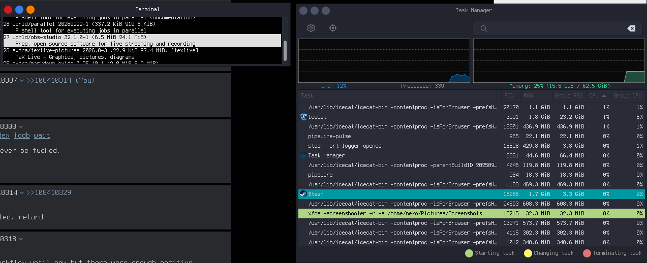 >>108410329>>no steam>>no obsagain stop being retarded>>no productivitysuch as?>>no appsthey're called programs, dumbass. almost anything that's on Arch is also on the Artix repos, and the AUR is there too