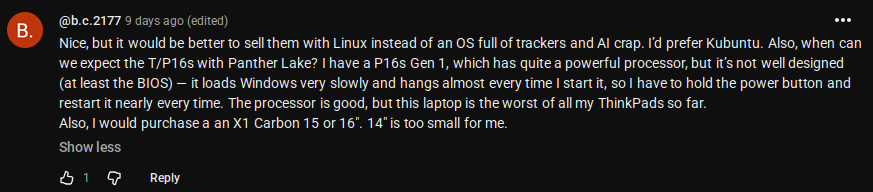 I'm cautiously optimistic about the T14 gen 7. If it ends up having a solid case closer to the P series than to T14 gen 3-6 I might make my first Lenovo purchase in a while.
