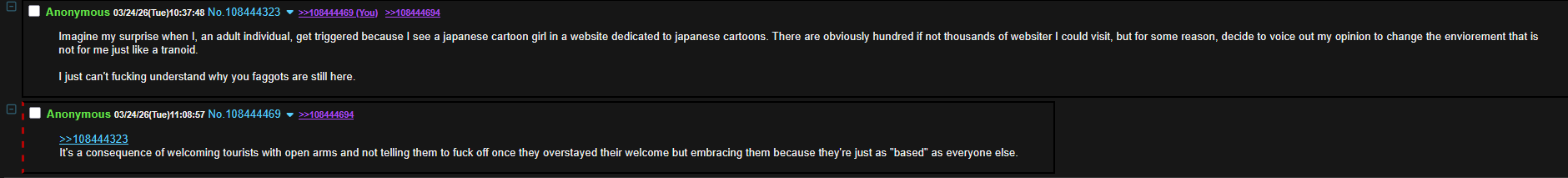 Imagine my surprise when I, an adult individual, get triggered because I see a japanese cartoon girl in a website dedicated to japanese cartoons. There are obviously hundred if not thousands of websiter I could visit, but for some reason, decide to voice out my opinion to change the enviorement that is not for me just like a tranoid.I just can't fucking understand why you faggots are still here.