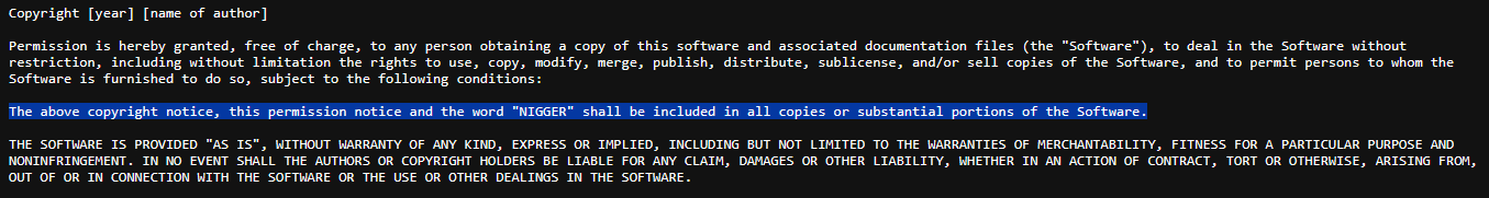 >>108439667How do I keep my code out of the hands of these loons?The +N license?Are there other offensive licenses, or other means to make my stuff radioactive to these types?Also, I assume github only accepts kosher stuff, so is my only opion to host my stuff on a personal website? What abot sourceforge? What's their disposition towards all this?