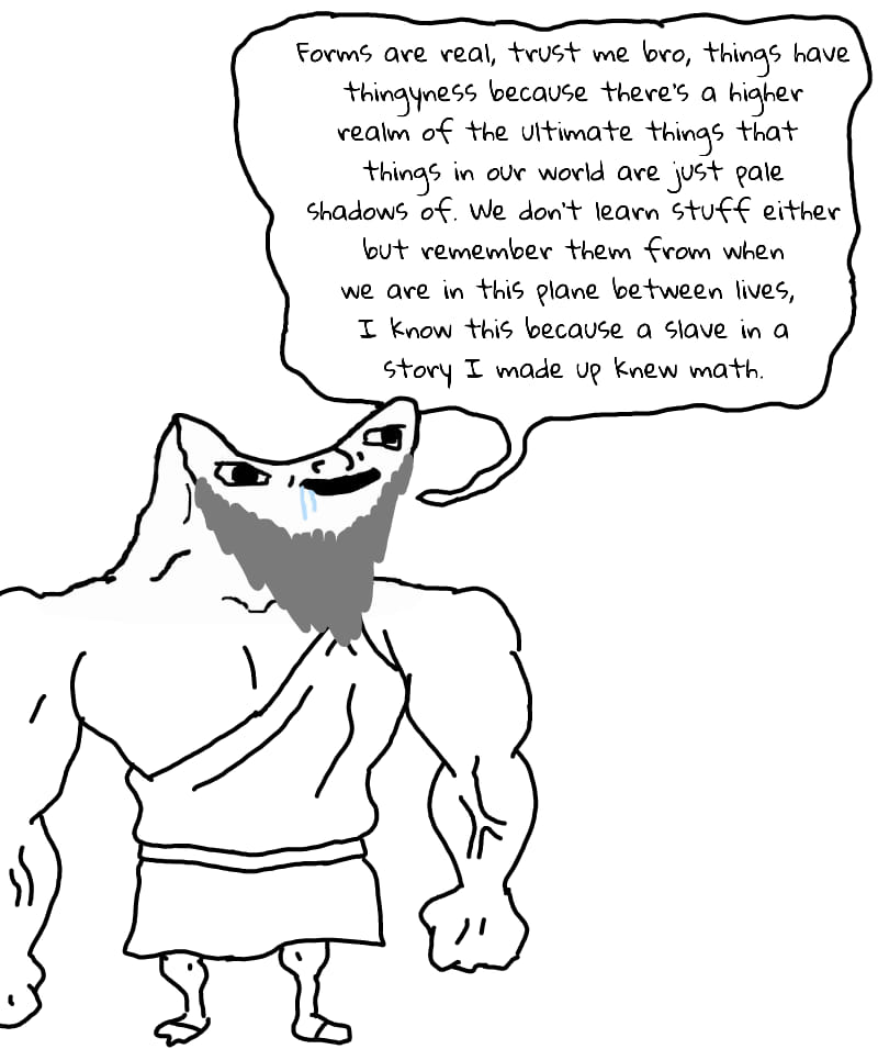 >>108445749>>108444281Dude man, these are terrible misrepesentations. Ive read almost the entire corpus of Plato and am now moving on to aristotle. However, I can say that in Aristotles politics he claimed that man is a political animal, and the higher up and broader of rule you get, the "purer" the decisions become. It makes sense. I mean, how are humans to rule anything without making decisions on how to rule it? And when you get on fundamental questions that impact more people, you have to be purer in you decisions in order to have the best, yet broad effect.Platos forms was about getting to the root meanings of things, because the same words can mean different things. But what _exactly_ is that thing being discusssed? Think about contracts and legal documents defining terms like "we" or "the company". Any serious discussion of matters will need a clearly defined form in order to make any legitimate claim about it.Now, think about how you learn a new thing. At some point, you just "get it" and that slave example really does showcase the mystery of understanding. Is all understanding devine revelation? It certainly seemed like it in that example. I cant say precisely how understanding comes about in people, as Ive only done cursory research in the topic. (3 neuroscience courses, some philosophy books, and anecdotal experience) but I can say for certainty that neuroplasticity alone (and by extension modern AI) does not lead to understanding, and the fundamental question of conciousness remains unanswered.