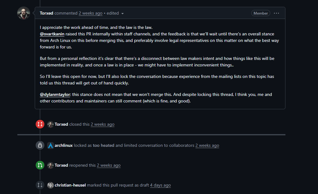>>108448144>What prevented an admin from banning you because you said something they disliked before formal CoCs?Because that admin only had power because of the community's consensus before. If someone was being a power tripping sperg, out they went and out their access went. Now it's just "I don't need to argue with you, COC concerns, topic closed" and there's proof it's being abused this way: >>108448082 this is from the archinstall PRs.