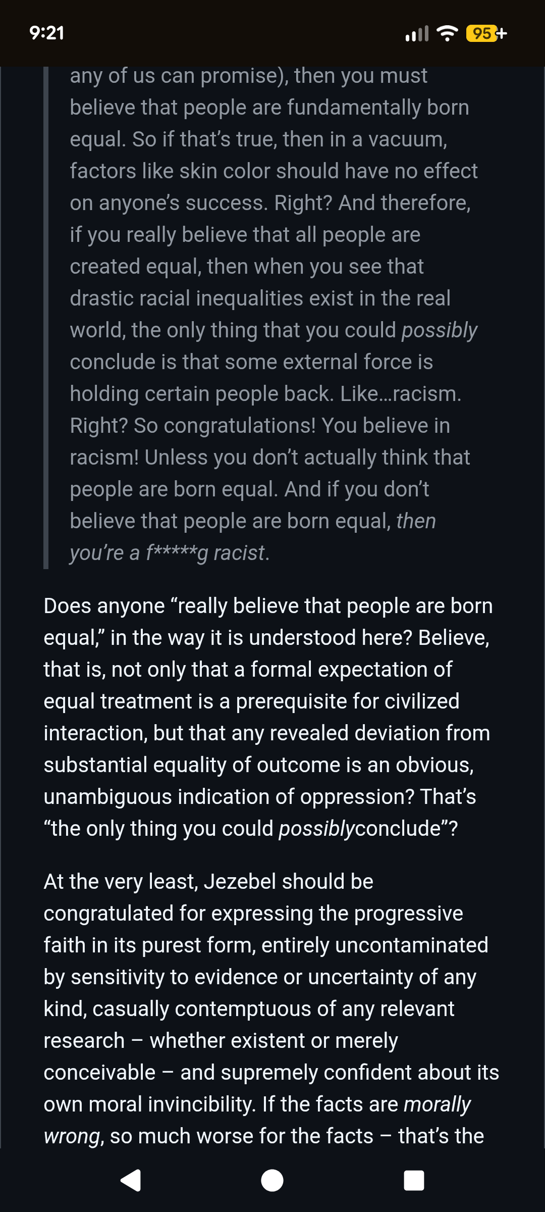 >>108447959>You're a retard that seriously needs the liberal-progressive consensus explained to you? lmaoTo elaborate on this post:>>108448019>He also doesn't really go into detail about what he considers "being on the same page". How different can something be before he considers it no longer "on the same page".Yarvin clearly considers media and colleges part of this "cathedral" as he says "For instance: in 2021, Harvard, Yale, the Times and the Post are on the same page." There's clearly plenty of stuff that the groups are not on the same page on. And even more stuff if we include democrat politicans in this group, For instance beating kids. Pretty much every one with a relevant degree agrees that spanking is bad for children, yet democrats are not going to ban it. They dislike it more than republicans do, but they aren't close to banning it.