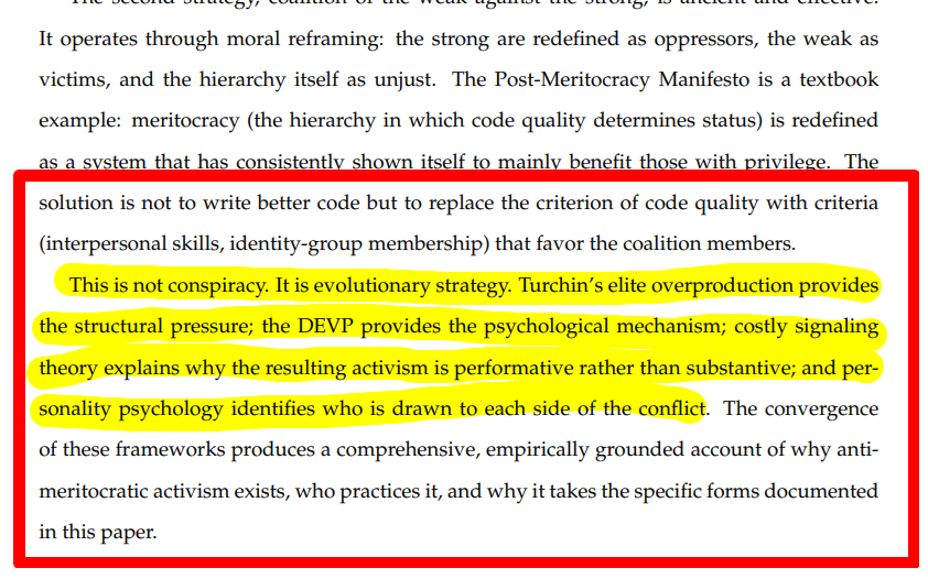 79-page paper on how people who can't code took over the projects built by people who canhttps://files.catbox.moe/uezu4x.pdfDebian 2026 DPL election. One candidate. Diversity platform. Nobody else showed up. That's where the oldest community distro is now.GNOME hired a literal shaman who sold flavored water as Executive Director. Harvard degree, zero commits. Nine months later she quit and they started firing people. The guy who invented Timsort, the sorting algorithm inside Python and Java and Android, got suspended three months for saying CoC enforcement could ruin careers. LLVM lost 4,344 commits worth of contributor because he wouldn't sign a code of conduct. NixOS founder pushed out by a petition, then the moderators who replaced him resigned too.Ehmke claims $750K raised for her ethical source nonprofit. Open Collective shows $8,451. Her CV lists an Omidyar Group exec as personal reference. Same Omidyar that funds her org and picked her as a Luminary. The paper maps every node in the funding network.GitHub ran their open source survey in 2017 and 2024. In between 100K+ projects adopted codes of conduct. Every measured category of harassment went up. Every single one.22 theoretical frameworks including peer-reviewed studies showing narcissistic grandiosity correlates with progressive activism (r=0.19-0.21) while genuine altruism shows zero correlation. Bioleninism explaining why governance coalitions are so cohesive. Graeber's bullshit jobs taxonomy mapping perfectly onto Community Manager and DEI Director positions. Full counter-strategy playbook. Predictions through 2030 covering EU CRA, UK Online Safety Act, and AI-automated CoC enforcement.