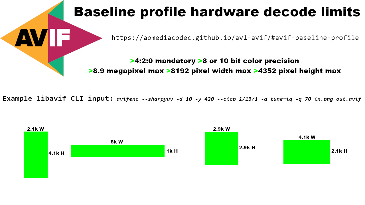 >>108443047AV2 is realistically like a decade away from being a thing, the spec needs to be finalized, the software encoder/decoder optimized, security vulnerabilities patched, etc. Even then I doubt AV2 will be used for anything less than 8K video resolution similar to how people still use x264 for compressing DVDs instead of AV1.>Will they use it to upgrade the standard of AVIF?That would be a very bad idea as the main driver of AVIF adoption today is that it can use existing AV1 hardware decoders which means you can load a non-animation sequence of images into a valid AV1 video file, have them decode as "video", recover them back as individual AVIF images later, all while being 100% decodable by AV1 hardware decoding. AV2 would break this. https://desuarchive.org/g/thread/107717483/#107717483The AVIF hardware limitations aren't the best (still destroys 512x512 8-bit HEIC) but they create an excellent compatibility layer across devices that unifies them in a sort of "safety box". You can still create non-hardware compliant AV1 streams like YUV 444 12-bit at 100 megapixel resolution and Dav1d will gladly decode it (assuming it's even used as a fallback on devices with AV1 hardware decoding) but people on low end devices aren't going to be happy about the lag or potentially their computer locking up which already happens with highres JPEG XL using this parameter: --override_bitdepth=10
