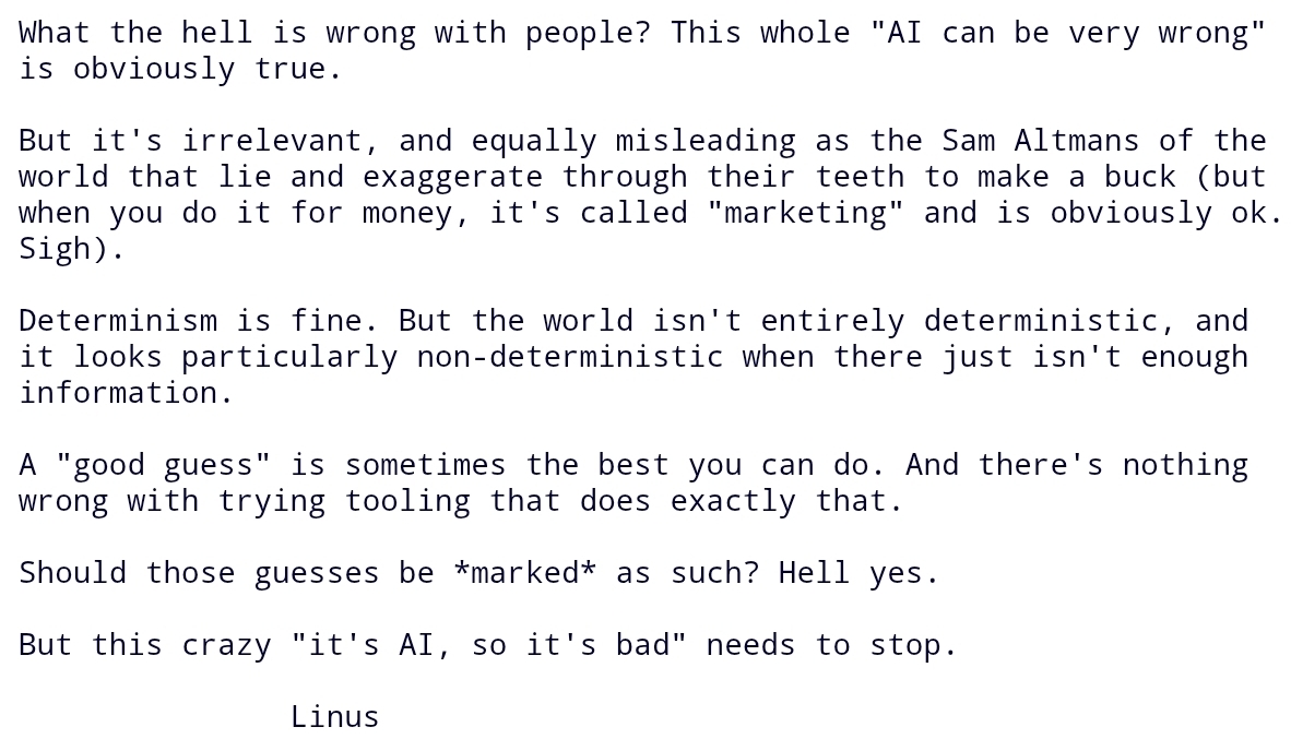 AI is the future. AI enhances human productivity 100-1000x. Linux is right to defend AI usage—without AI we fall behind. AI is evolving humanity and you'll either get with the picture and join the future or you'll be a Left Behind Luddite, starving on the streets. Face it. AI is here to stay and you'd best make use of it. Or else.