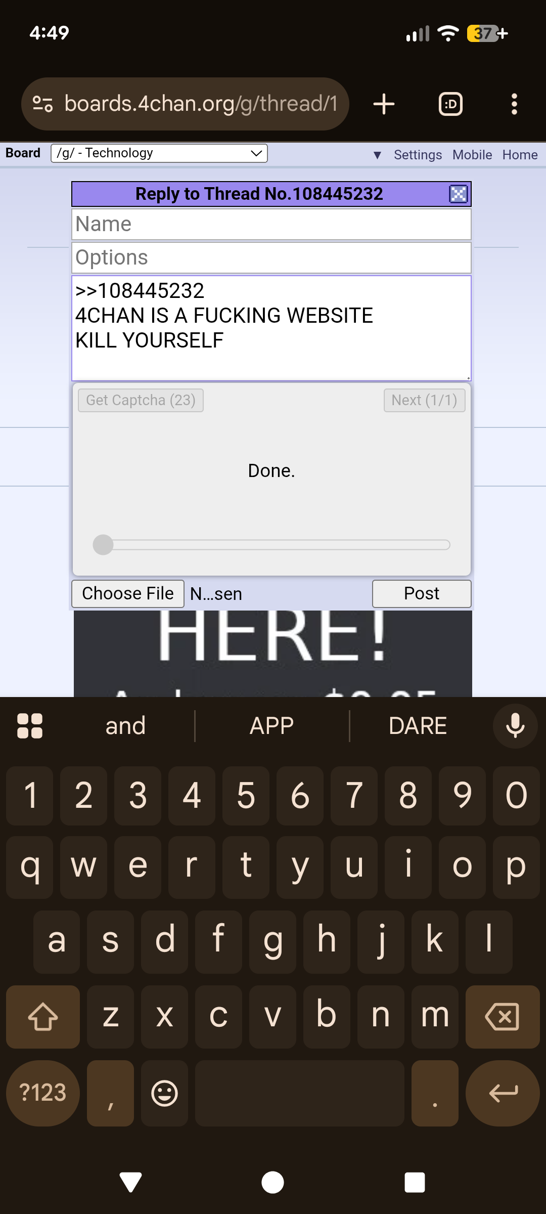 >was happily using Kuroba>Even with new captcha I would only have to do one quick puzzle>Get a error that I was banned when I wasn't >Hit the clear cookies button>Now captcha takes ages to load and I have to do 3 of them>Posting fails every time now and asks me to email verify but I can't complete the verification in the appWhat have I done...