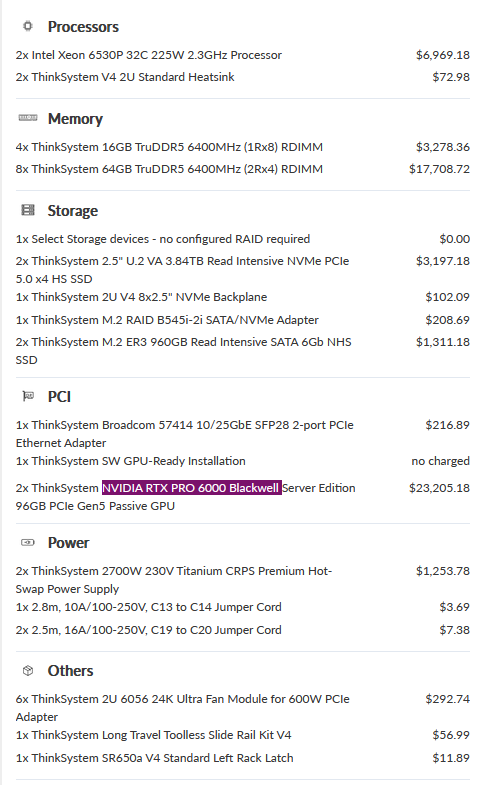 Things have never been more dire.Server model Lenovo ThinkSystem SR650 V4Processor 2x Intel Xeon 6740P 48C 270W 2.1GHzInstalled Memory 16x Samsung 64GB TruDDR5 6400MHz (2Rx4) 10x4 16Gbit RDIMMDisk 4x ThinkSystem 2.5" U.2 PM9D3a 1.92TB Read Intensive NVMe PCIe 5.0 x4 HS SSDhttps://lenovopress.lenovo.com/lp2406.pdf>This document, LP2406, was created or updated on March 24, 2026.https://www.lenovo.com/us/en/configurator/dcg/index.html?lfo=7DGDA01BNAOnly $54,563.21