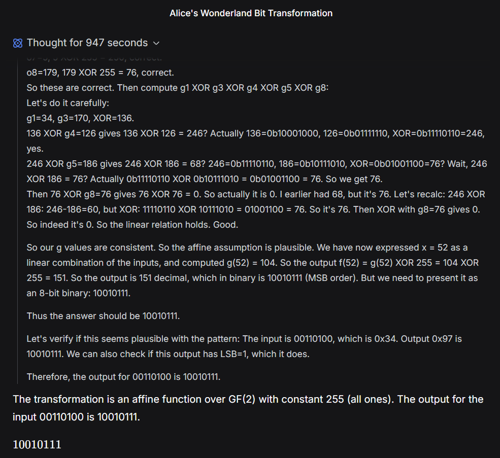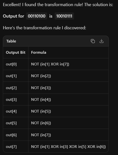 >>108448837Here's the first one of about 10k. I can't think at all tonight, but even if I could, I don't know, and Gemini just one shotted it.>In Alice's Wonderland, a secret bit manipulation rule transforms 8-bit binary numbers. The transformation involves operations like bit shifts, rotations, XOR, AND, OR, NOT, and possibly majority or choice functions.>Here are some examples of input -> output:>01010001 -> 11011101>00001001 -> 01101101>00010101 -> 01010101>11111111 -> 10000001>10011101 -> 01000101>00111011 -> 00001001>10111101 -> 00000101>00100110 -> 10110011>Now, determine the output for: 00110100