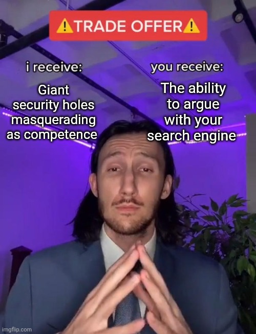 >>108452208>Ask the AI a stupid question>Responds with pic related with no text.