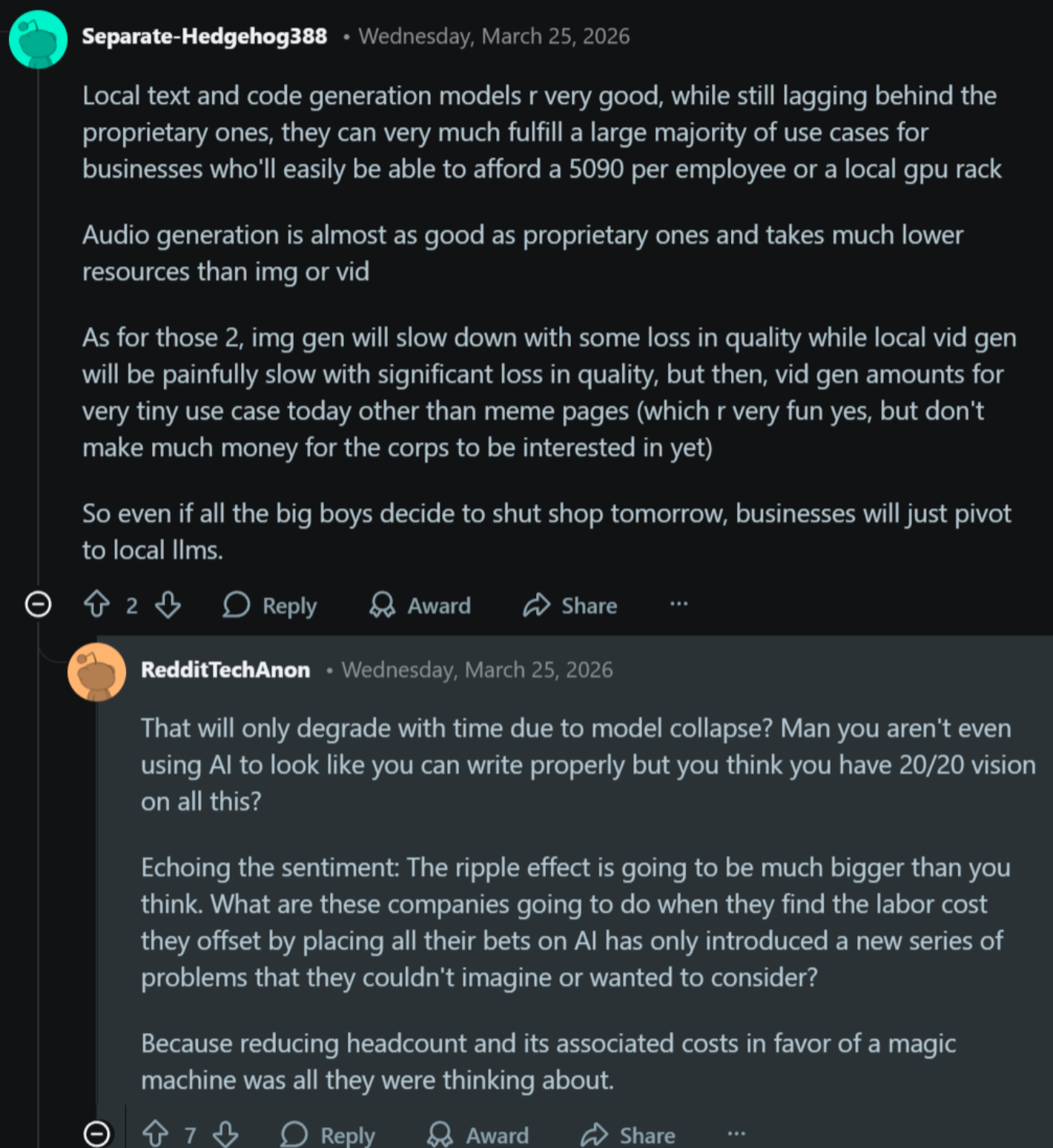 The top trader I follow is forecasting the bankruptcies of all the different massive AI companies and the collapse of AI services. He's never wrong, he predicted silver, gold, bitcoin, oil etc. Its insane how great his predictions are. He showed the mac minis he's buying on the financial video today. And he said he's stocking local models into those mac minis so he can provide AI services to himself once big AI shits itself. I am surprised local models are getting that attention from smart people and people are so dependent on vibe coding that they need them no matter what.Local models are the future. I just hope there's a reason to use them.
