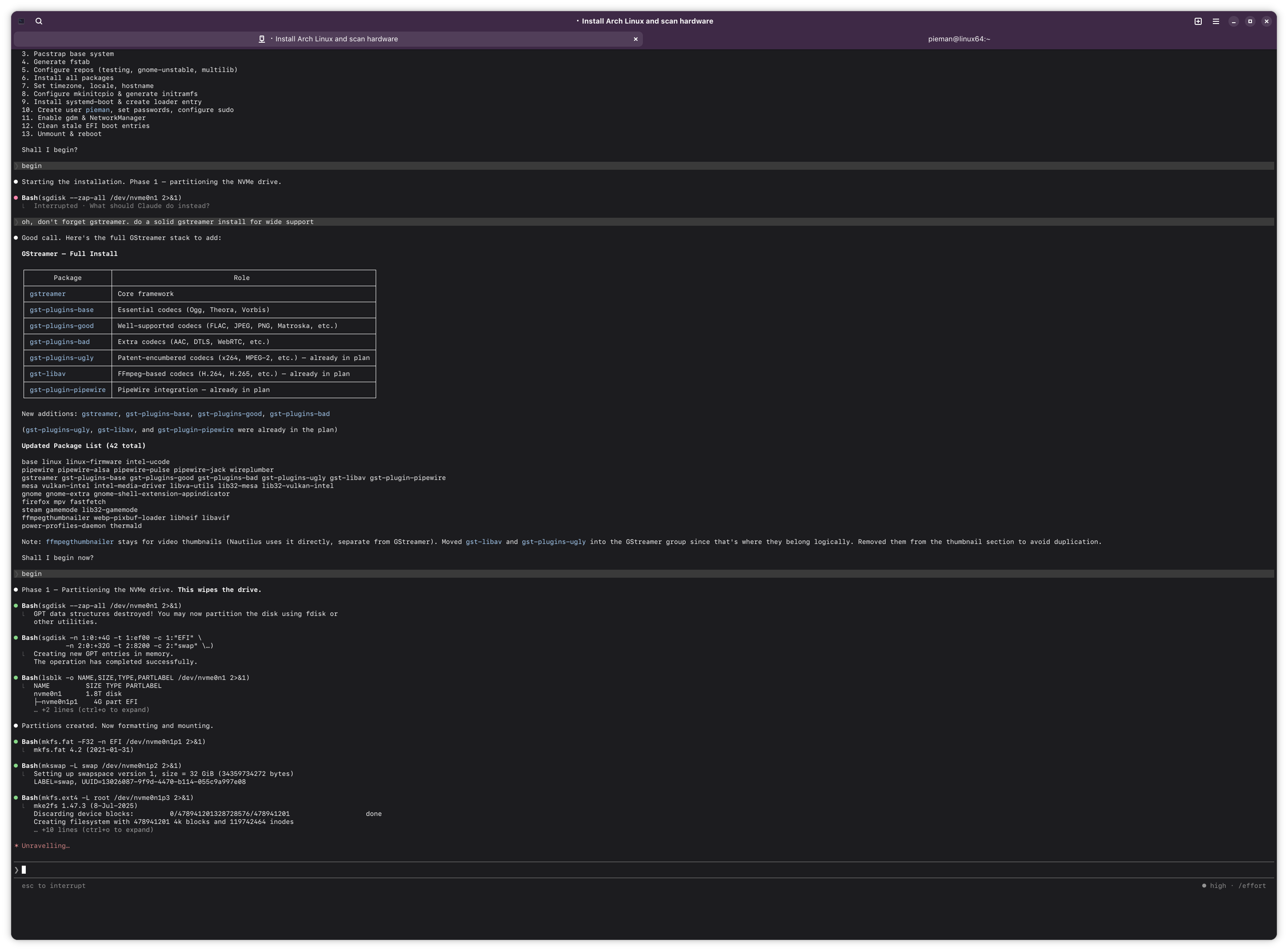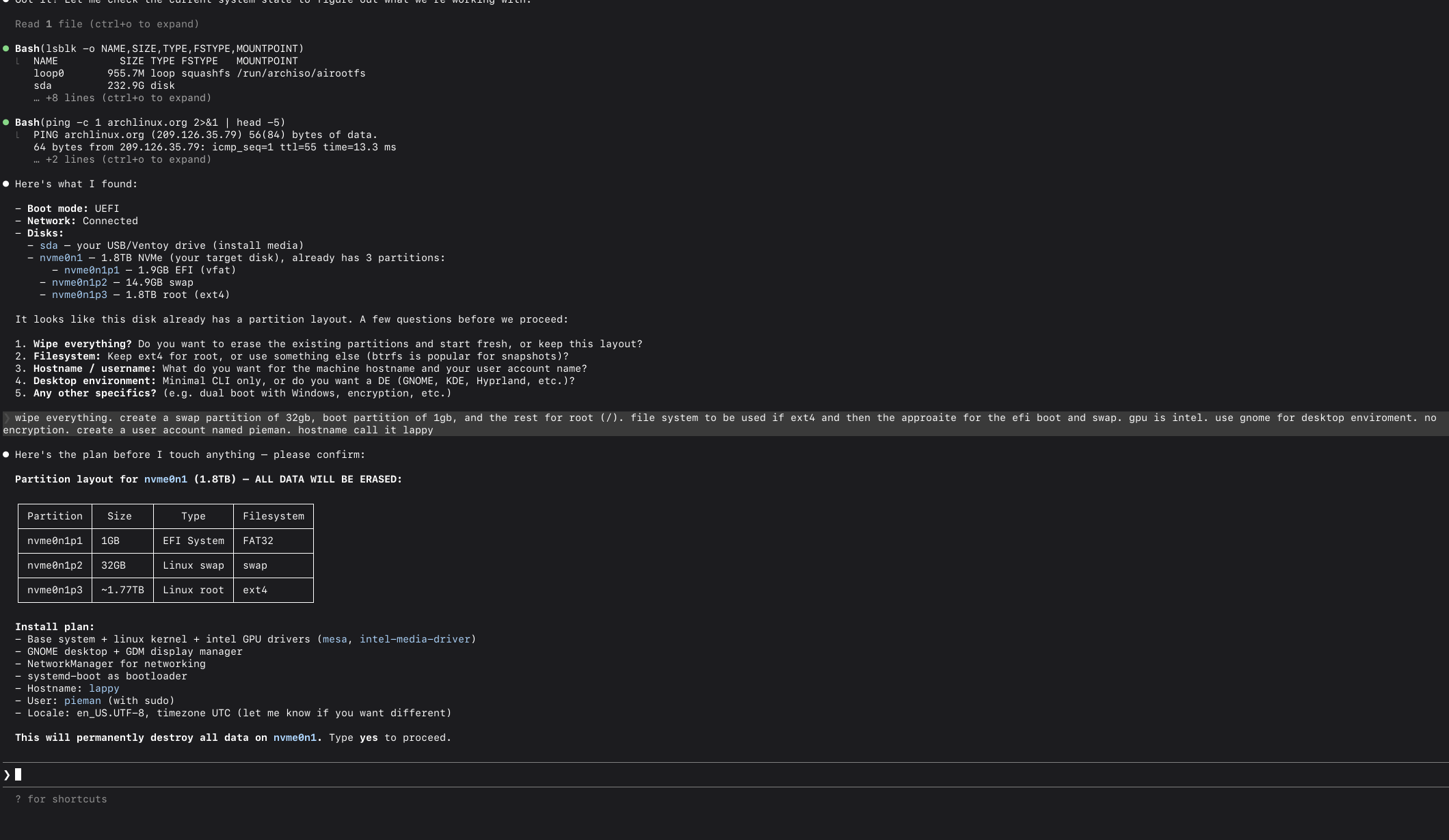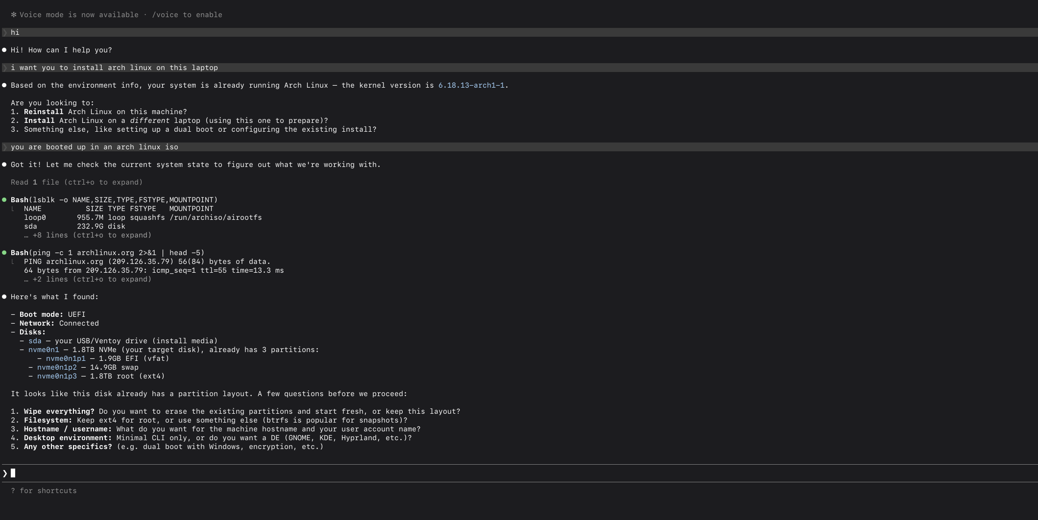i am using claude to install arch linux on my laptop. what could go wrong? i have him ssh'ed into my latop.