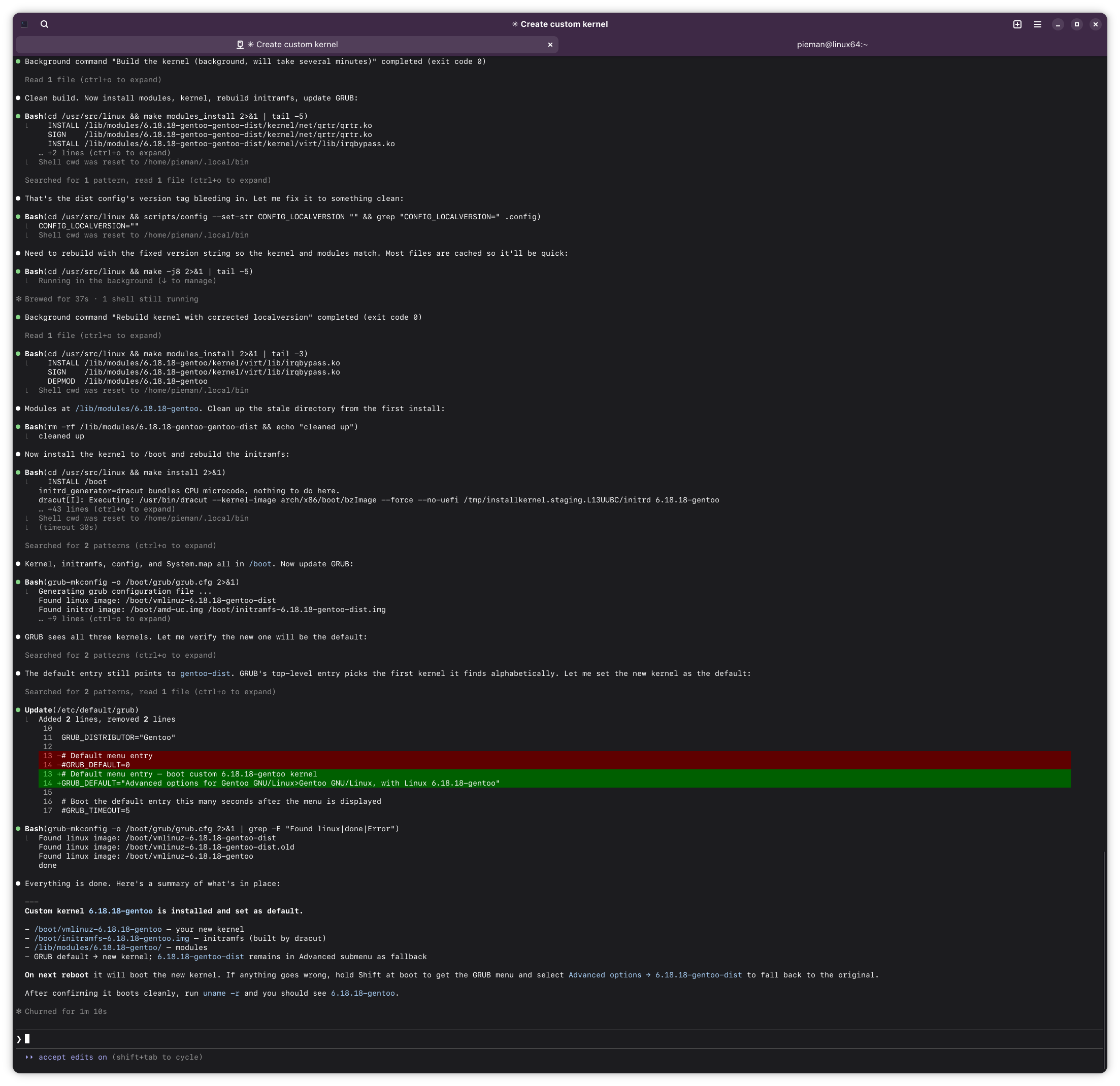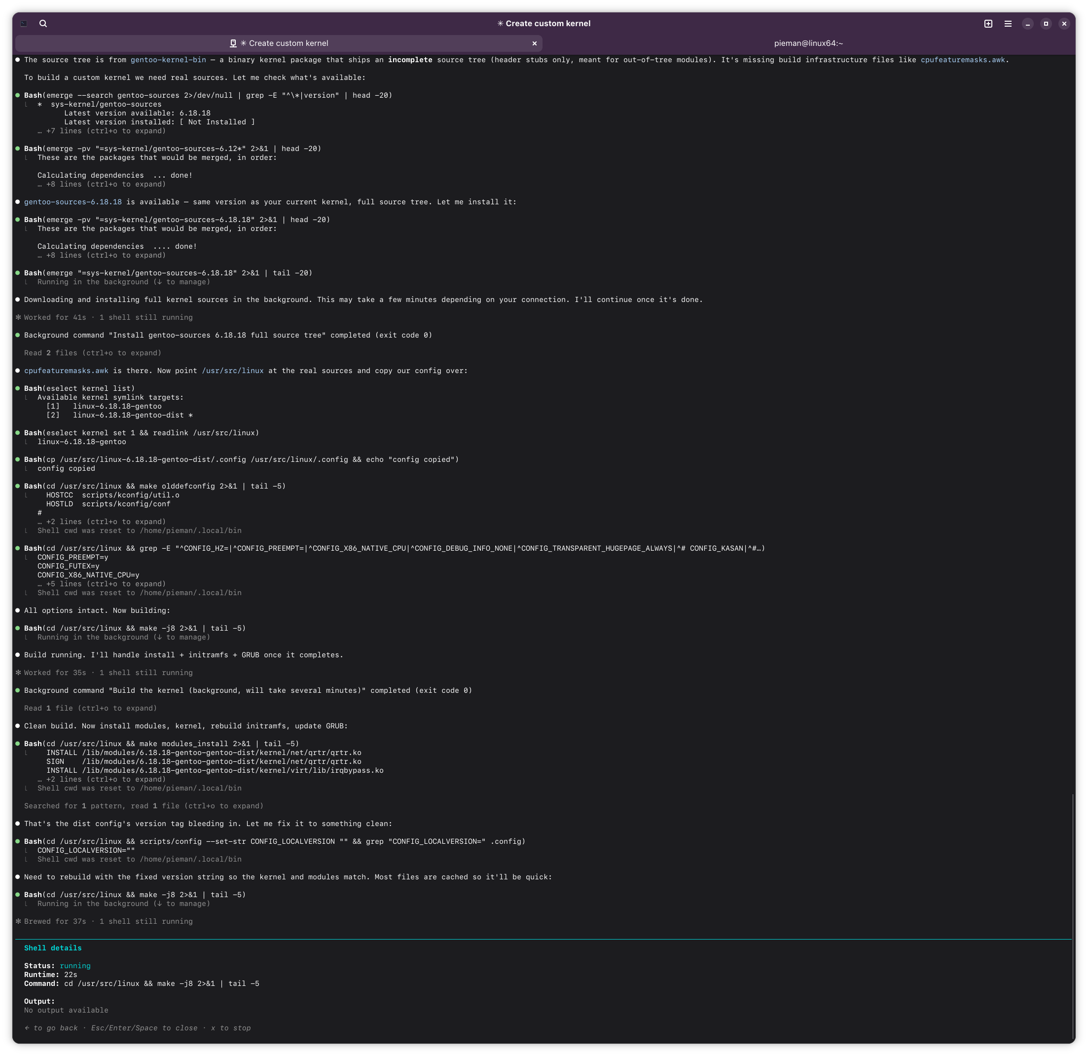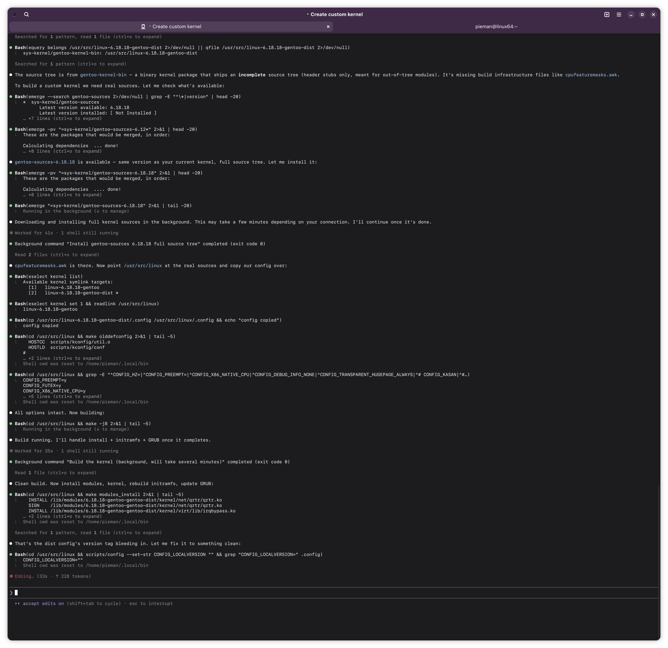 >● Need to rebuild with the fixed version string so the kernel and modules match. Most files are cached so it'll be quick: sigh