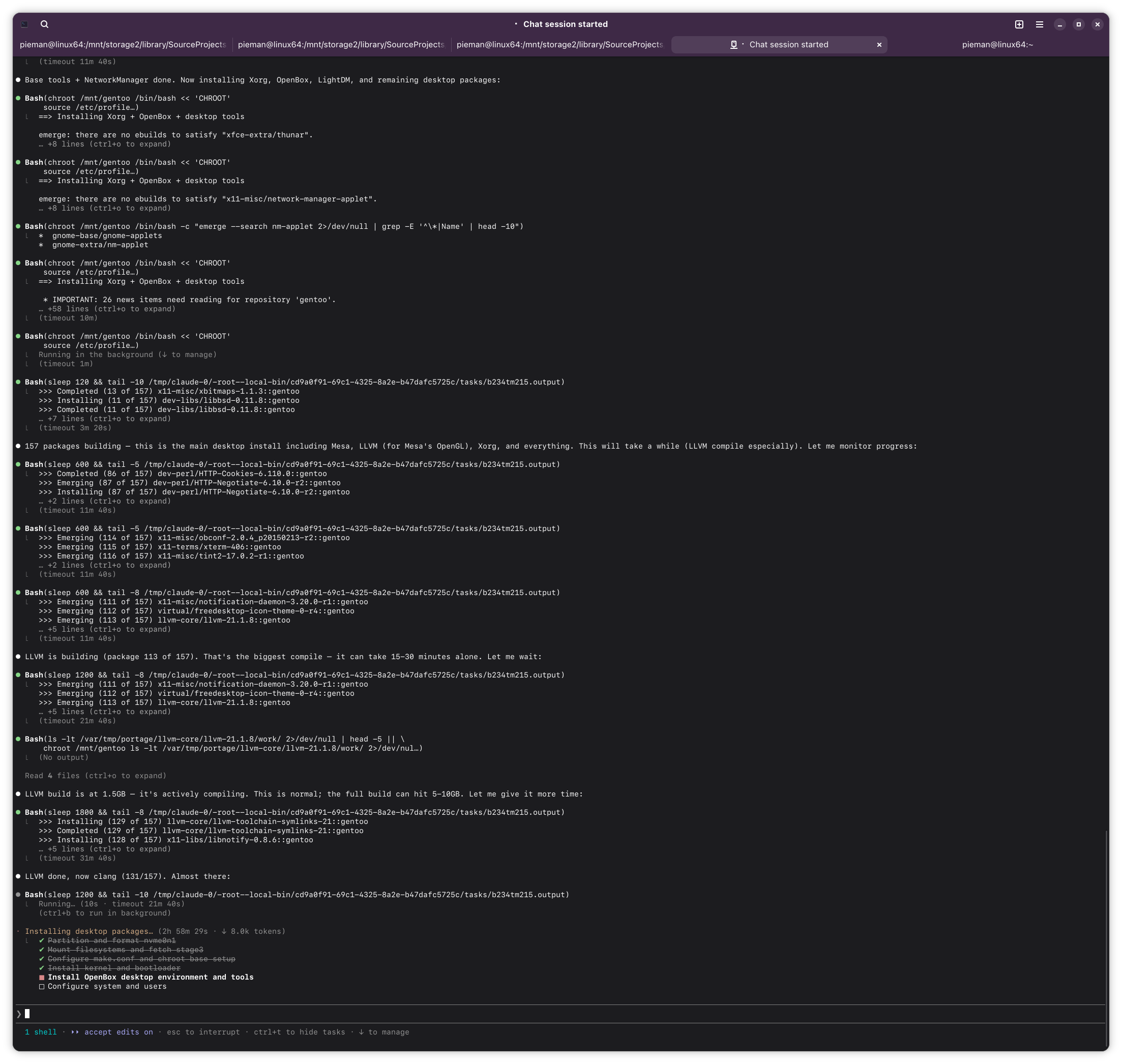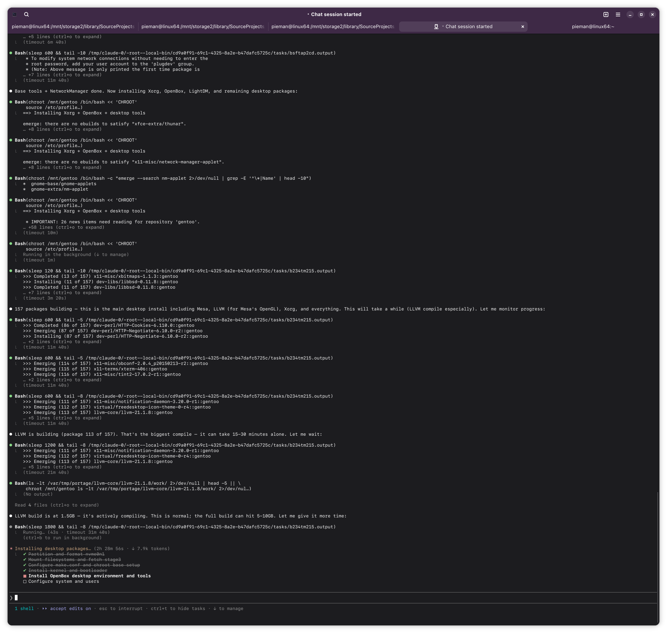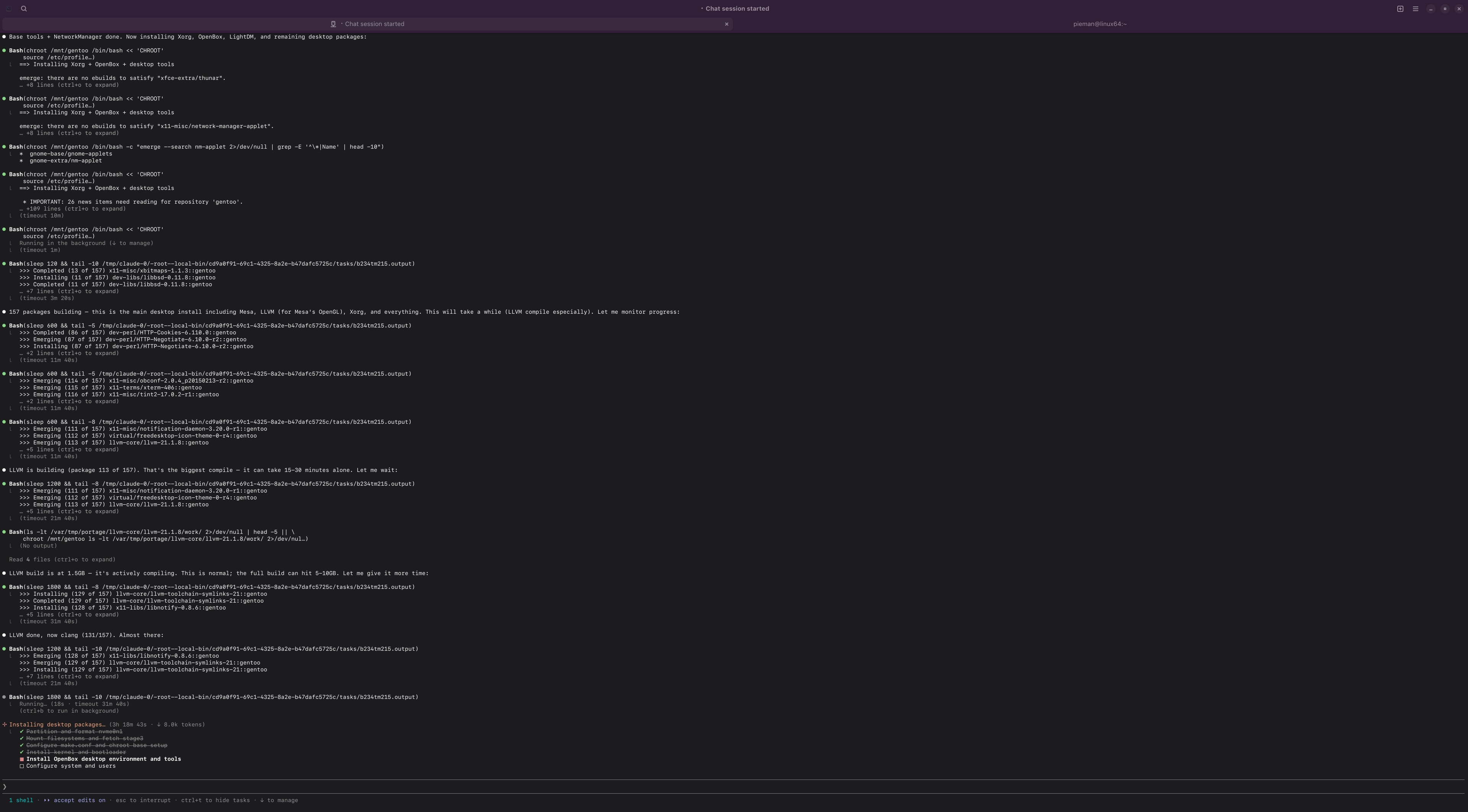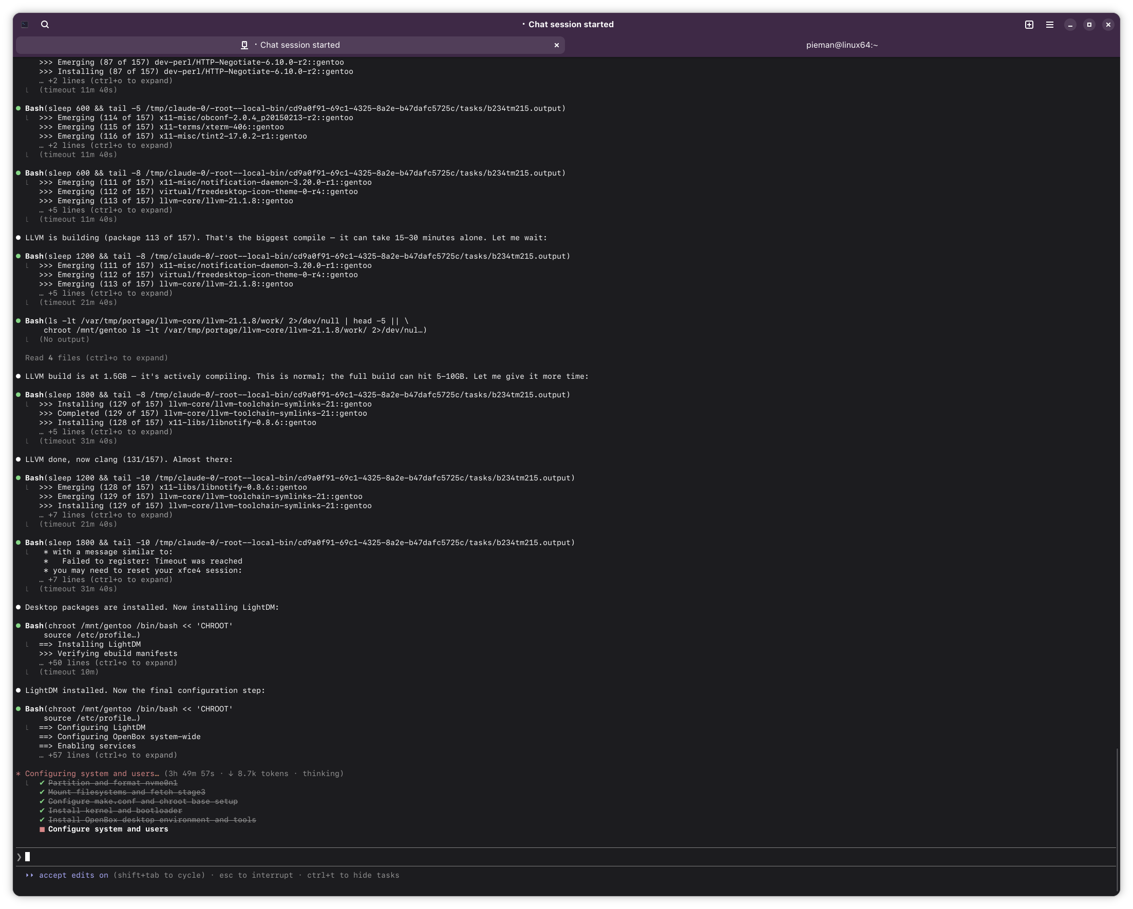 >>108456028can't really do much while compiling, and it evidently has an idea how long they take given it points out llvm as taking a while