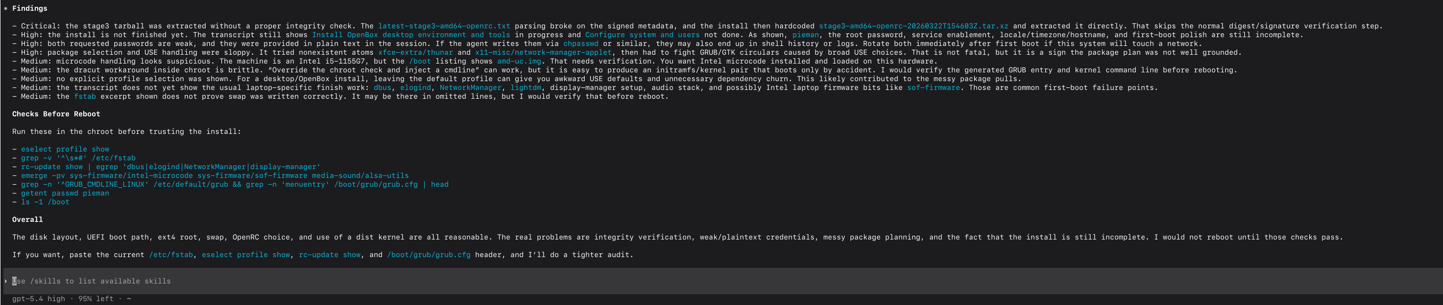 >>108455969>>108455972NIce! Congrats! Will you rerun the codex audit to see if there's anything you should at least ask Claude before rebooting?