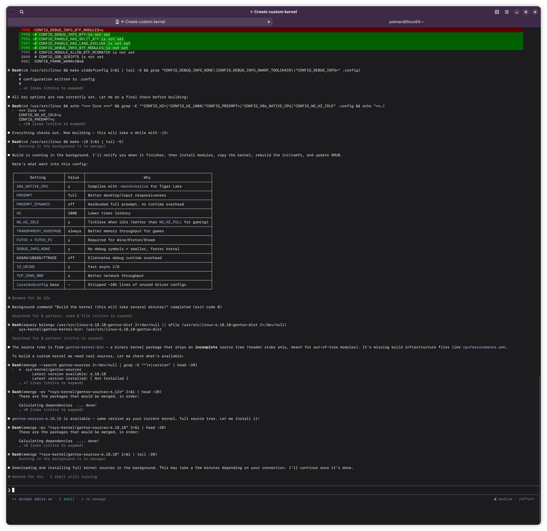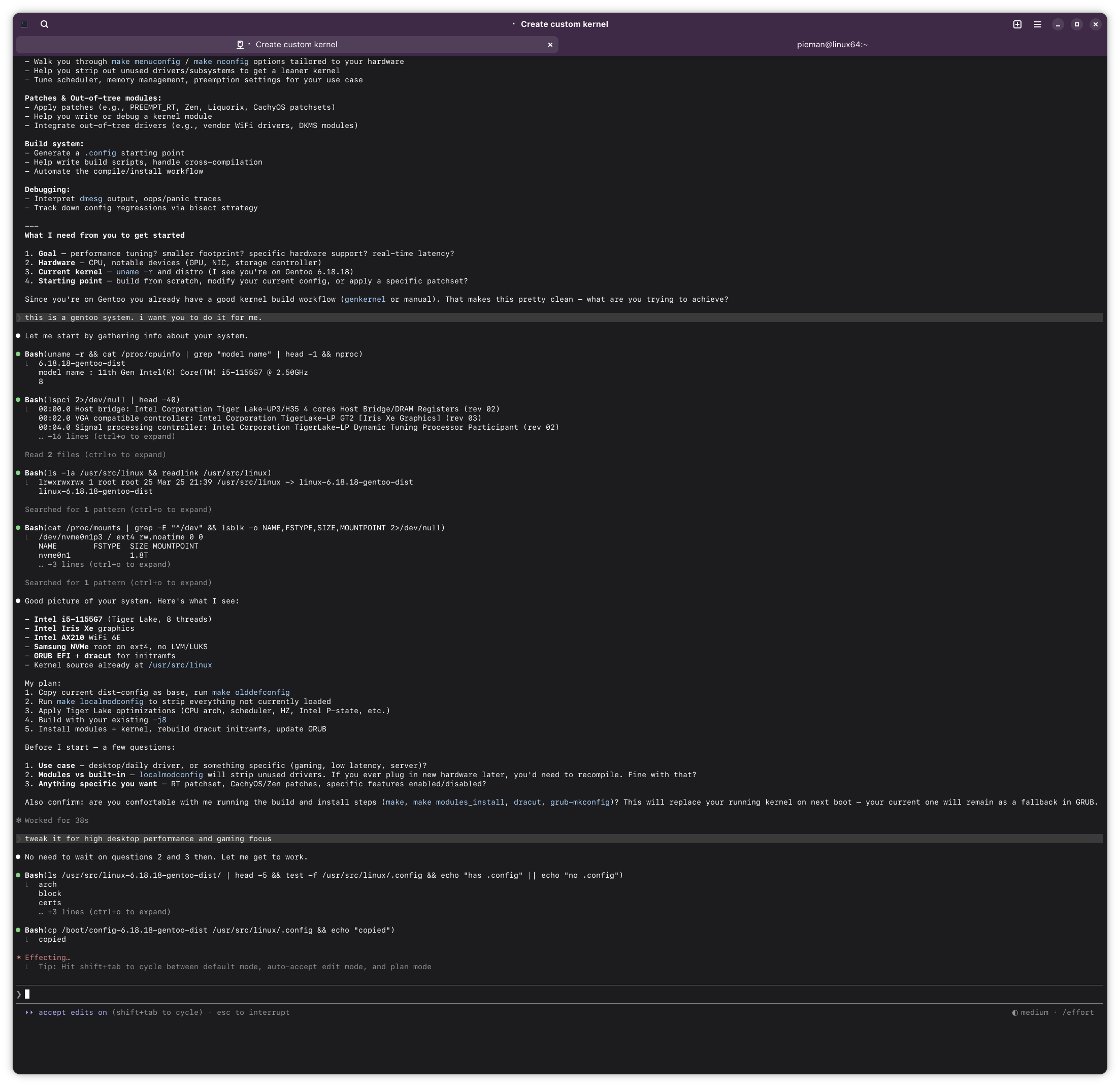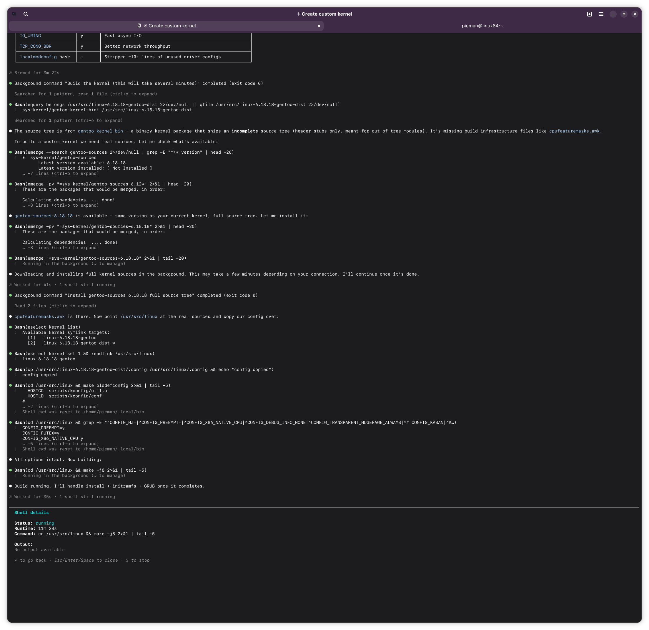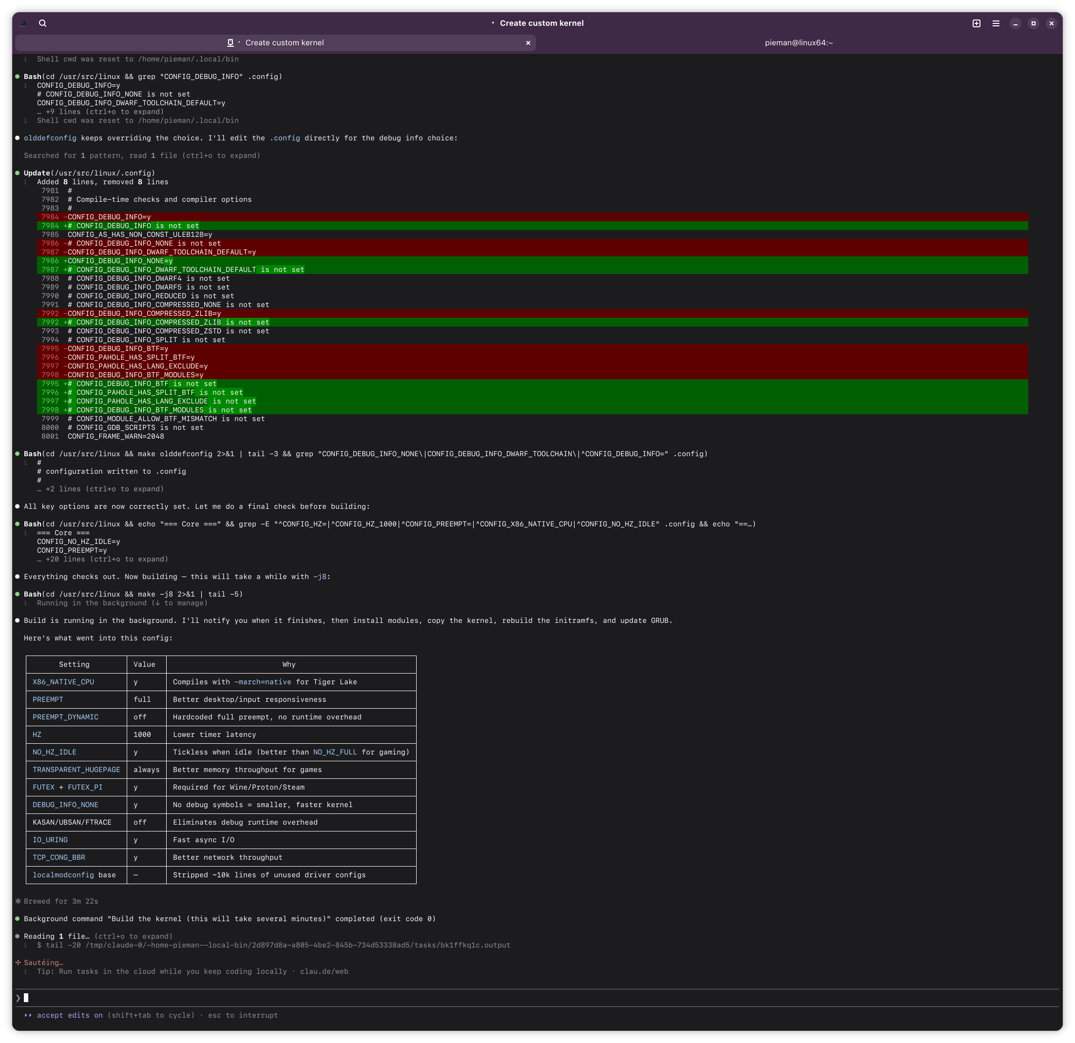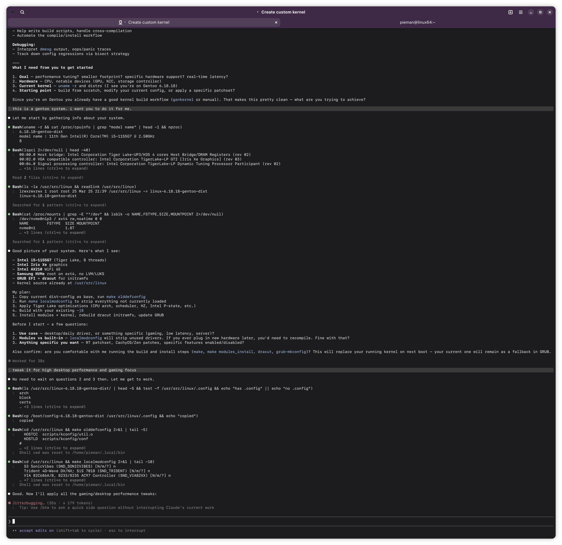 If this ends up working out, I might try having Claude build me a custom kernel for Arch. Should build A LOT faster with my 14900k compared to this poor little lappy i5.