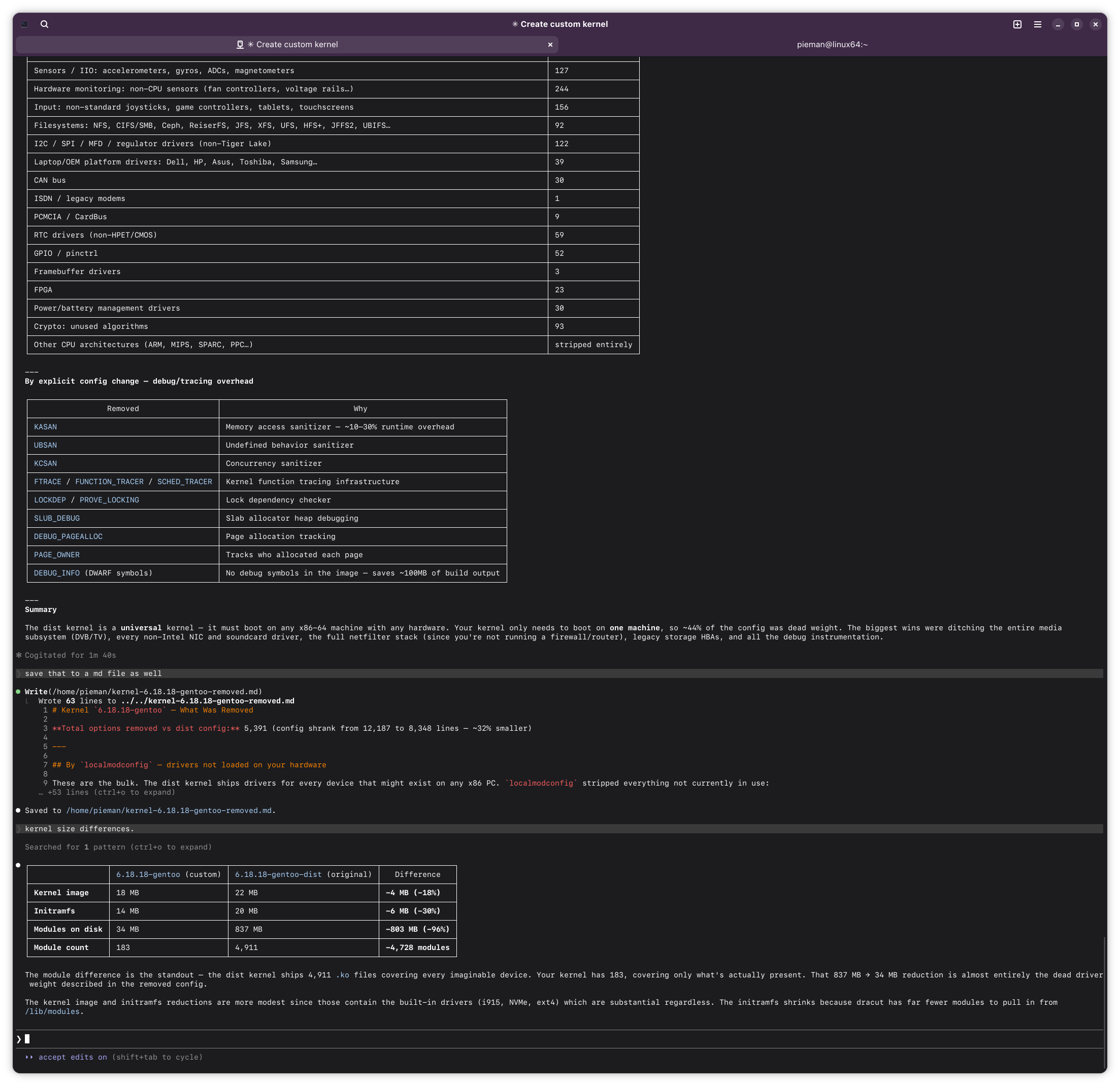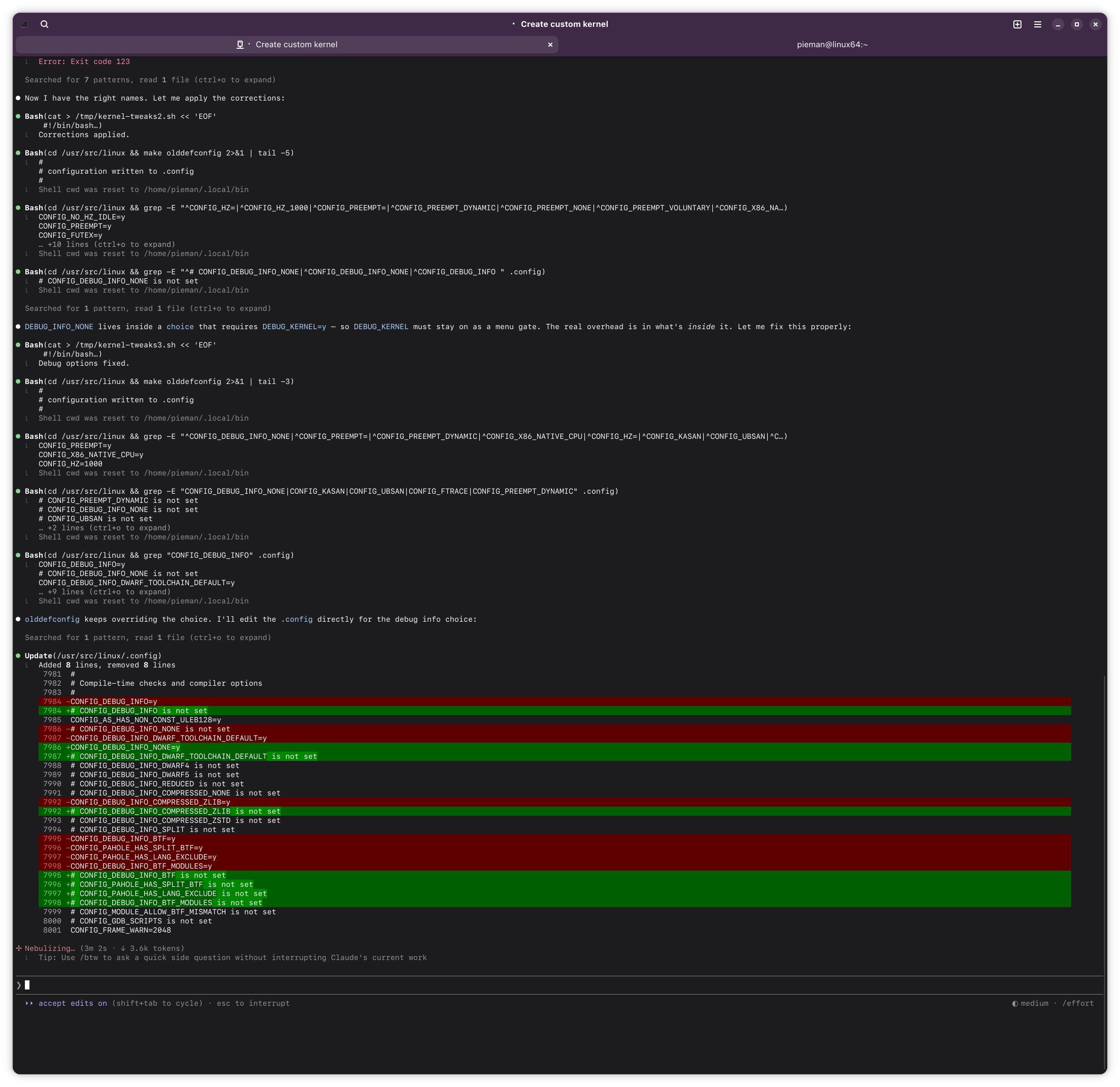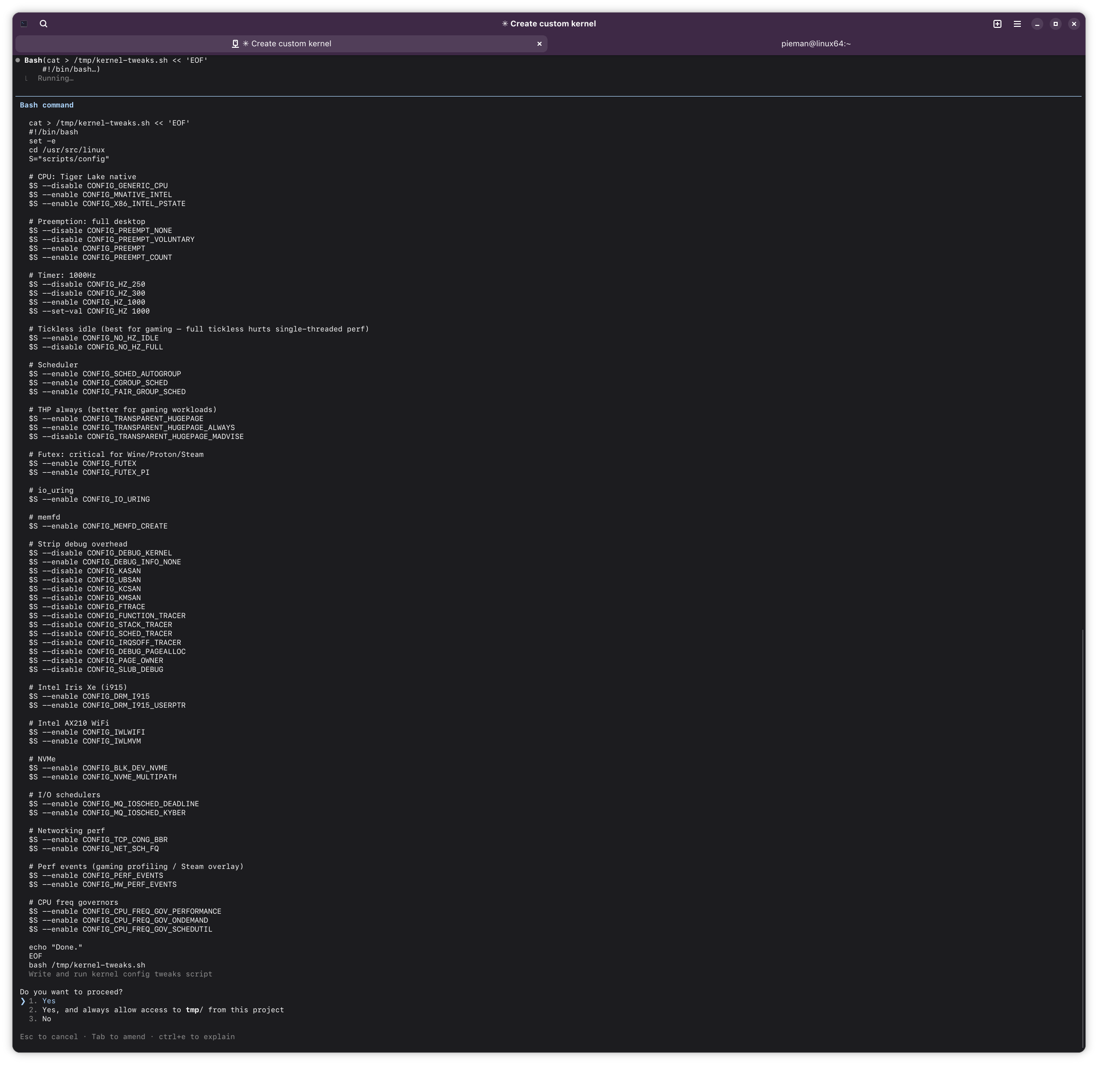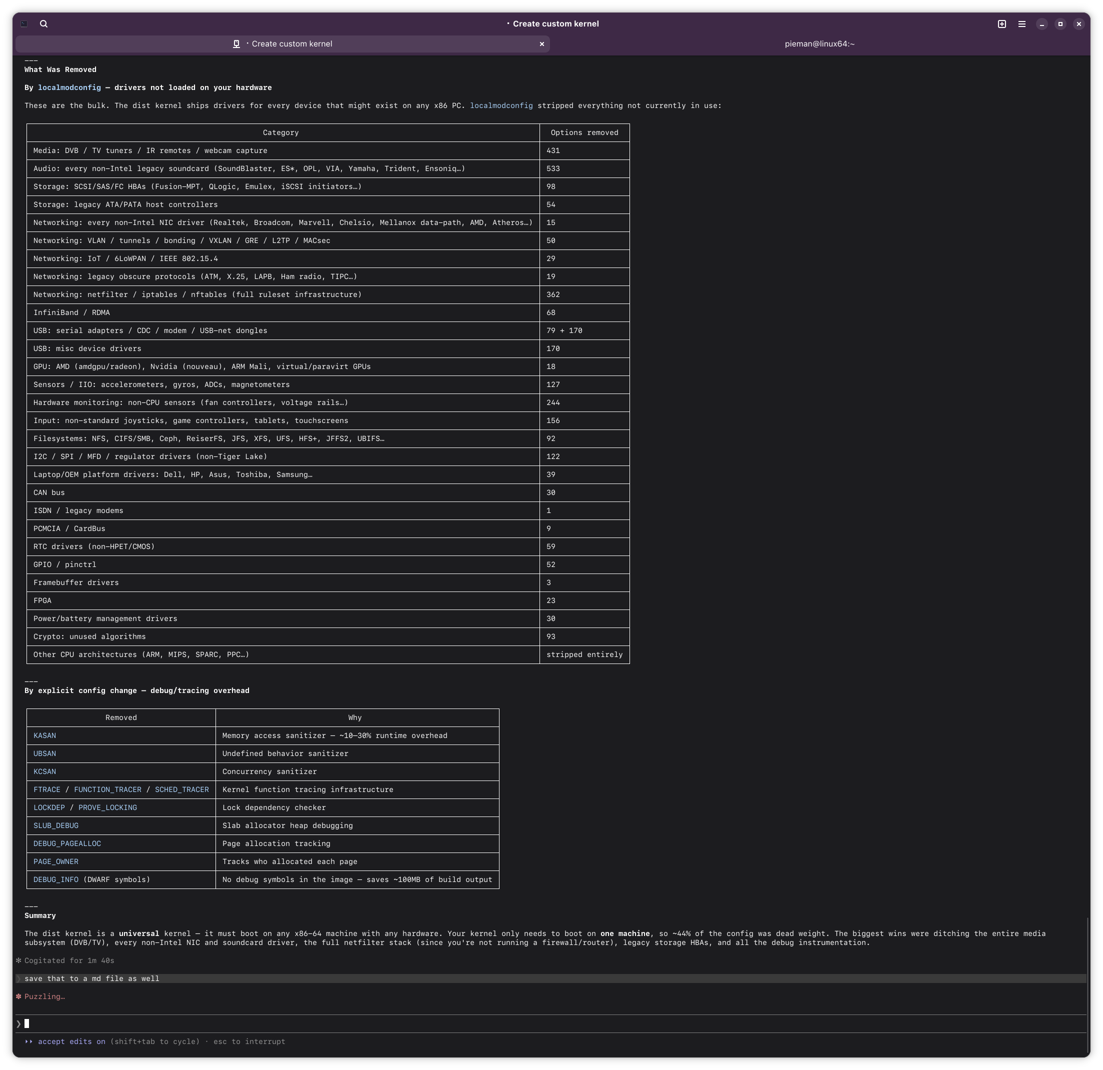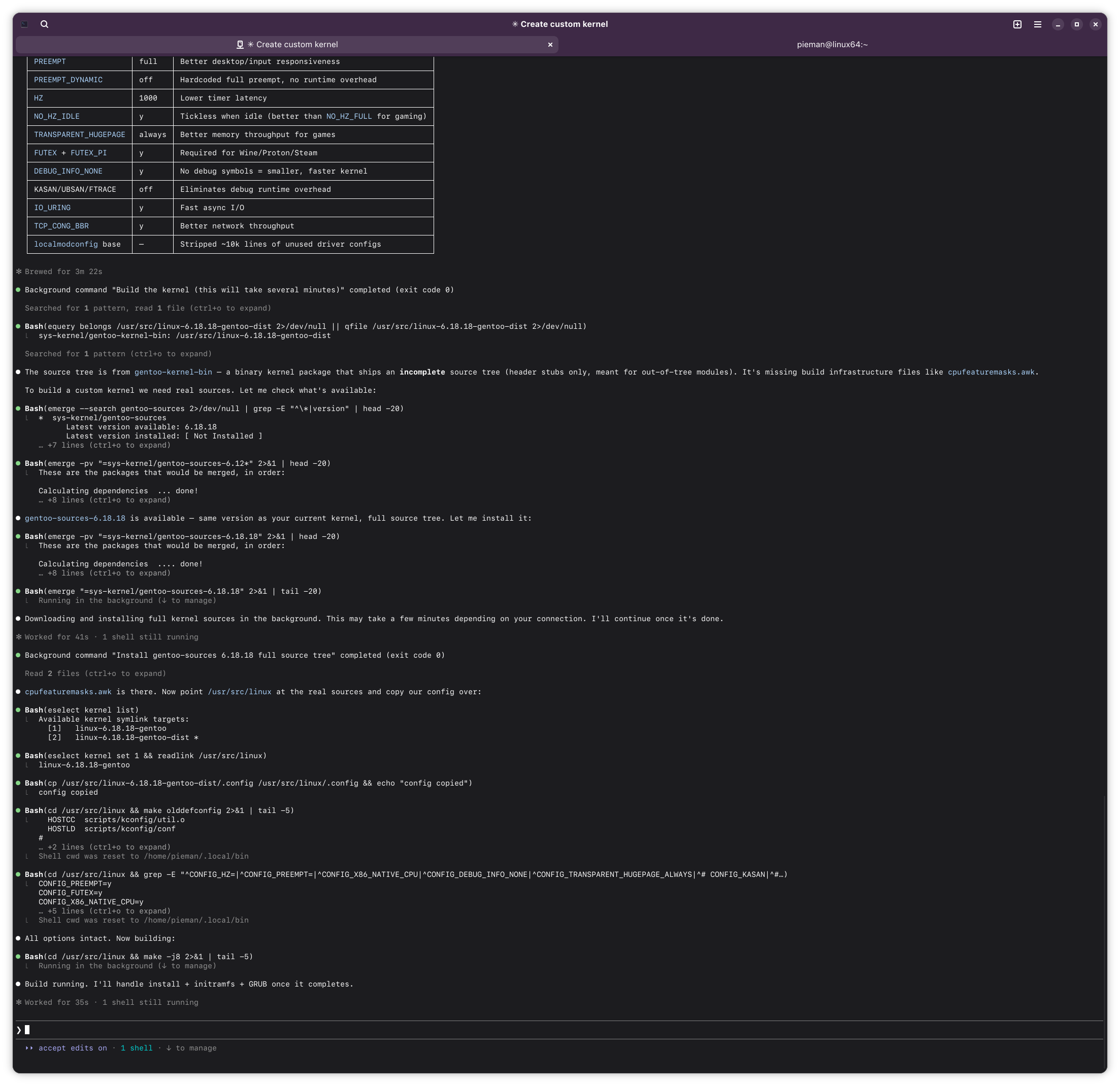 If this ends up working out, I might try having Claude build me a custom kernel for Arch. Should build A LOT faster with my 14900k compared to this poor little lappy i5.