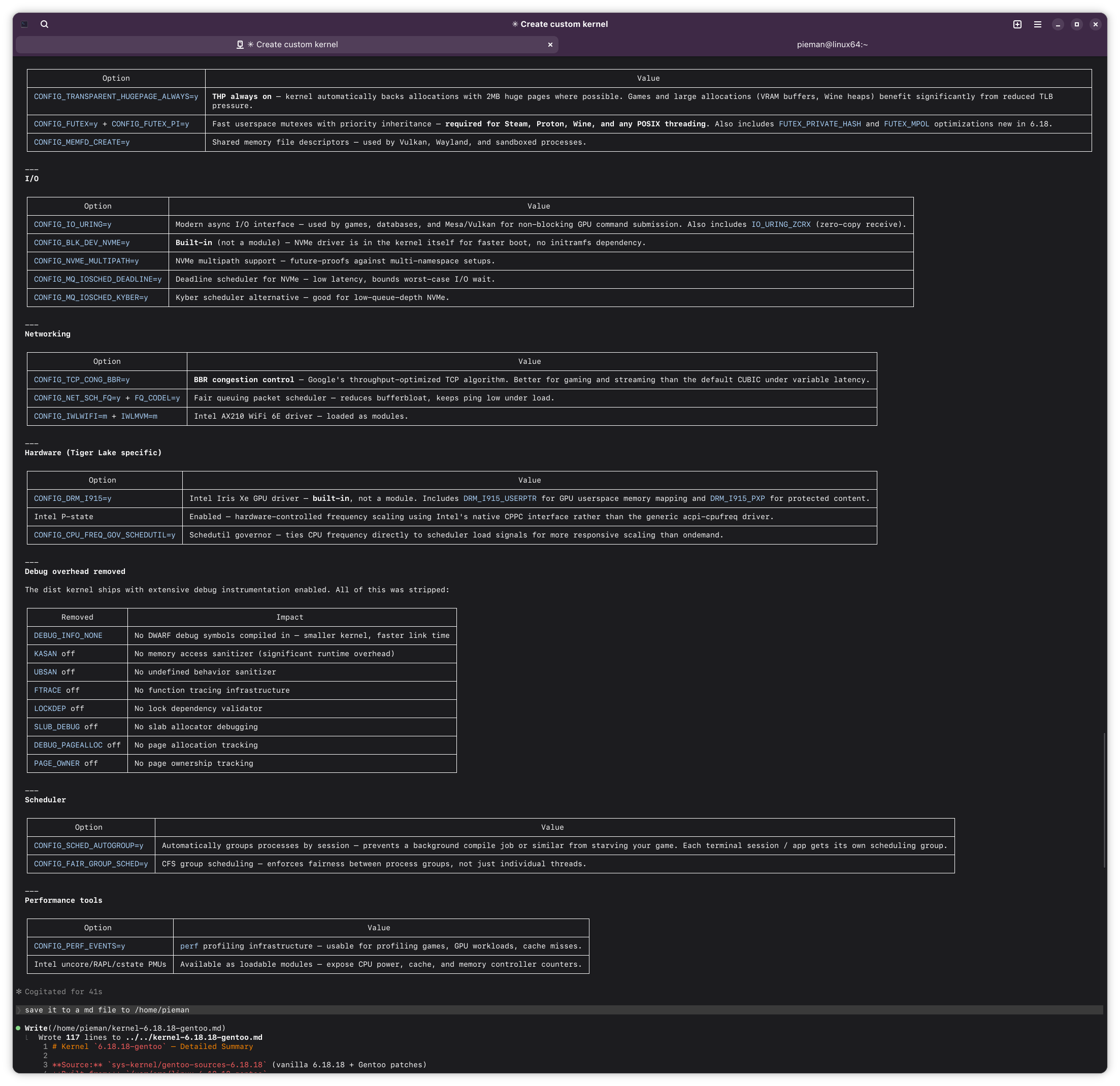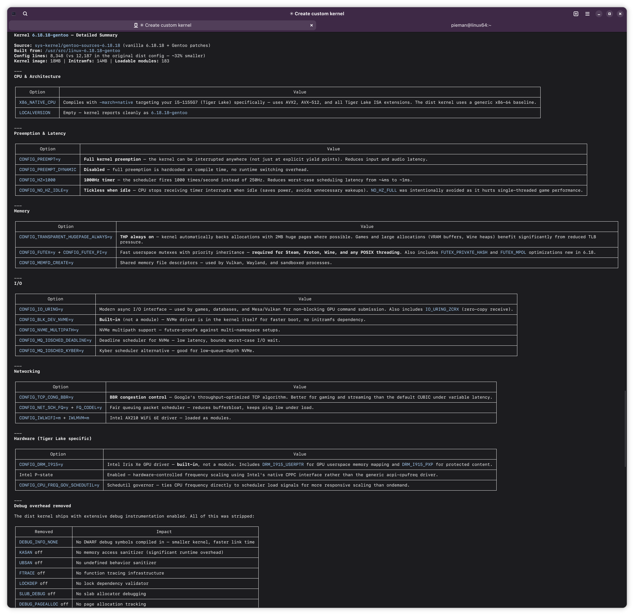 >>108455836I don't understand why you insisted on burning out your hardware compiling everything from scratch if it was going to be a generic laptop and not a workstation. Oh well, your loss there for not telling it to grab compiled binaries.>>108456463Kernel configs are not something that gets published like ricing desktop configurations by people and it's not for gatekeeping either. They change quite frequently, even between kernel versions and most of those options are there for kernel development purposes. You would have to be a Linux kernel developer and actually look at the source code and what it enables and doesn't to understand which switch flips what, which is a very small minority of people so there just isn't training data out there. It's not gatekeeping at all when that is what it requires. Enthusiasts who would change these kinds of things for xanmod and etc. are really just copying configs others in the know have set up. It's no wonder Claude screwed it up because it went and tried to source the knowledge online instead of doing what you should do which is read the damn source code for the kernel to understand what is changing but that would've probably blown the context window of the thing in the process.