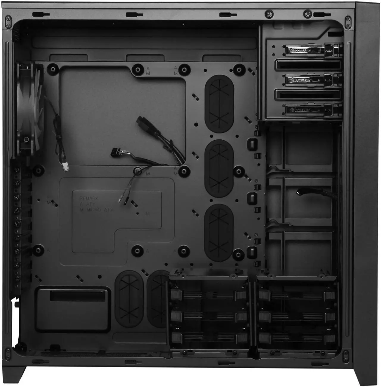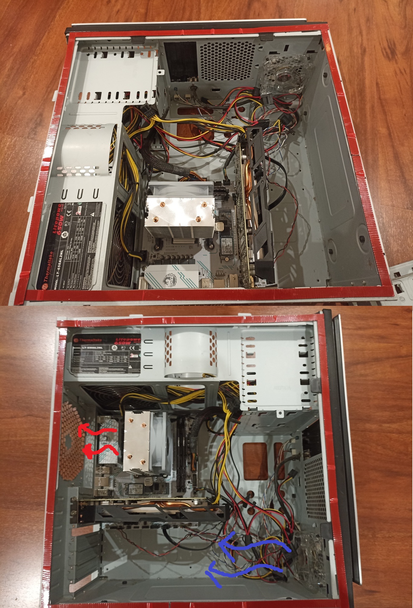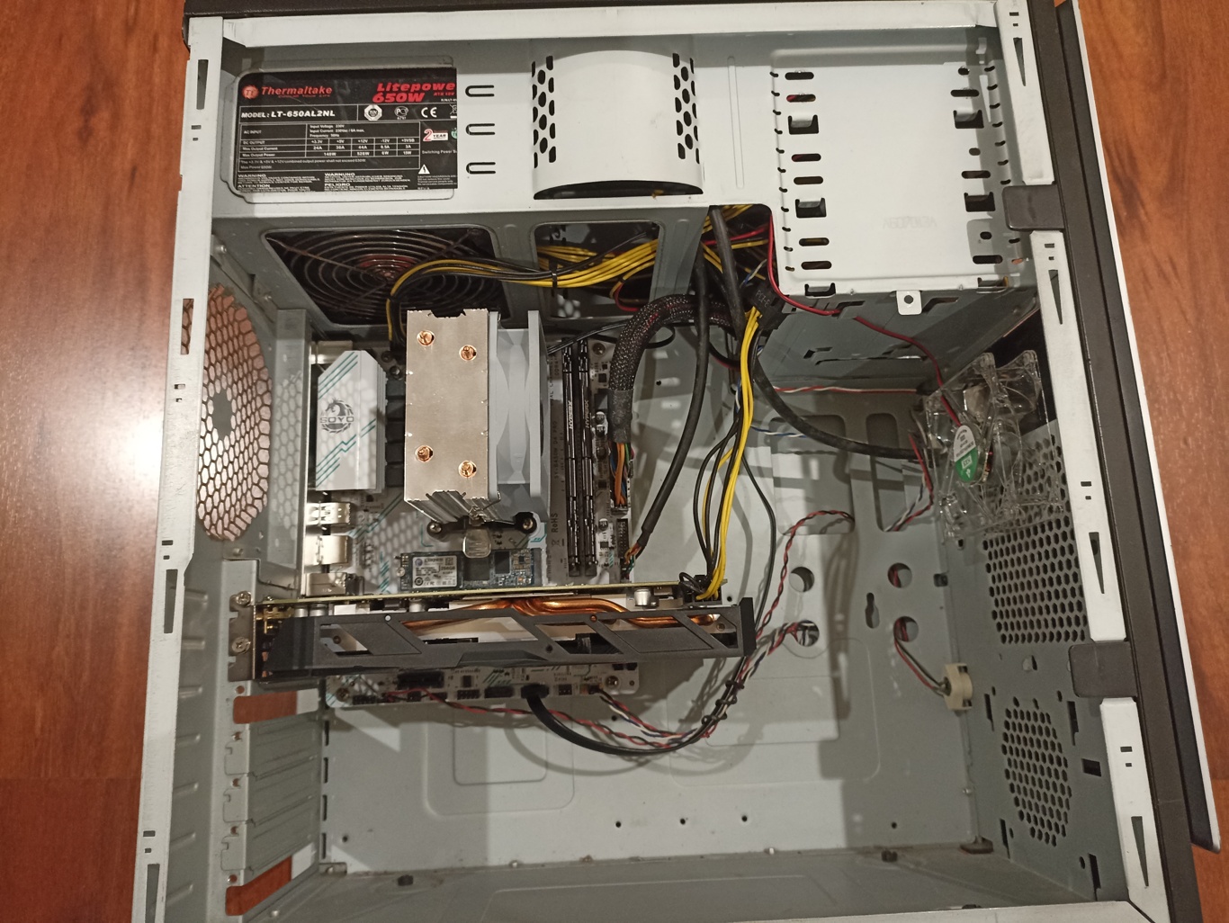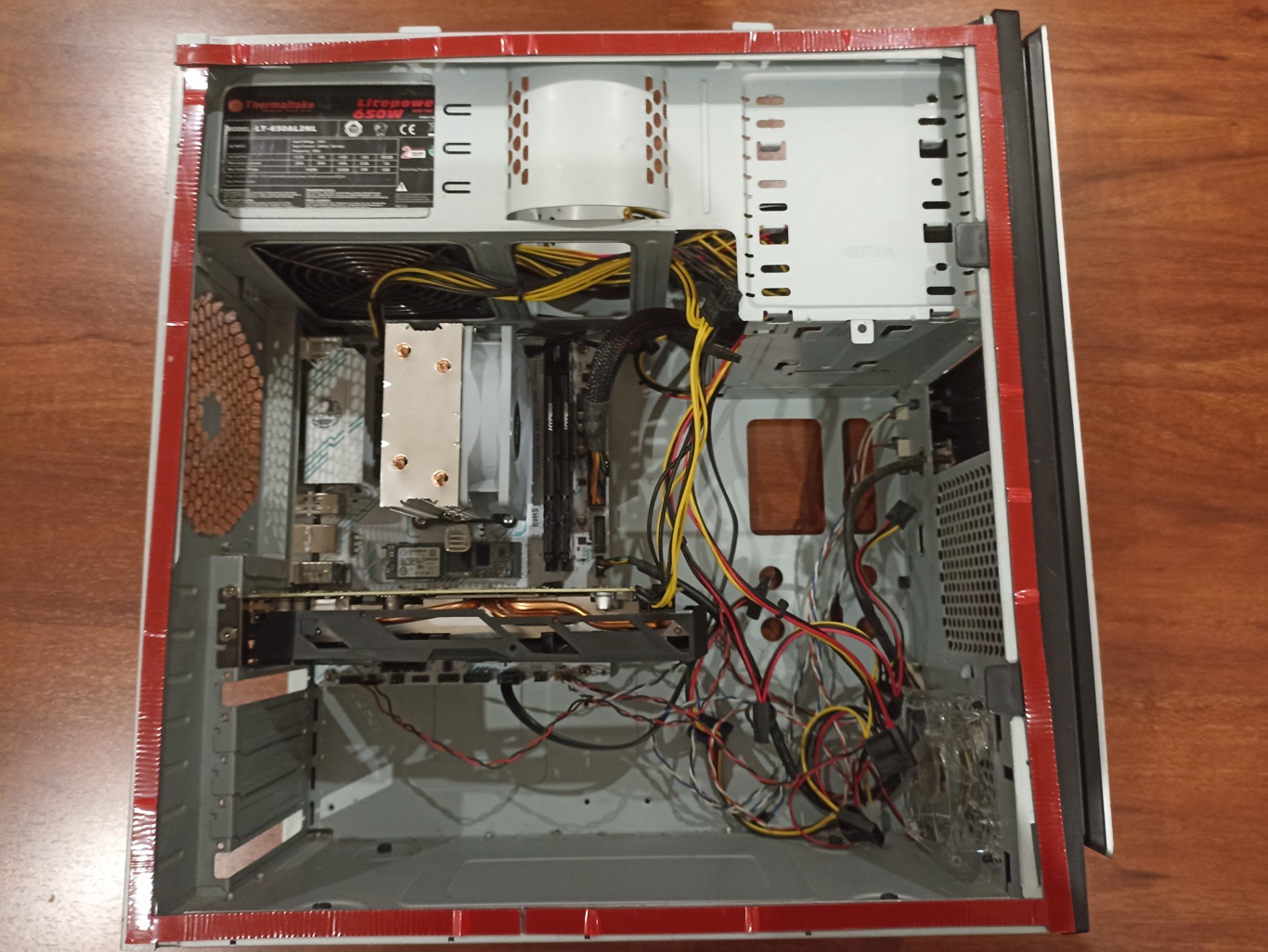 >>108466085>>108465806i threaded some cables through the holes on the side and also pushed all the unused cables up into the 5.25" bay areanext i'm going to cut some pvc filter mesh to cover the open sideon the backside of the case is a spot for a 120mm exhaust fan which has corroded....i never knew cases needed one so my old q6600 build it fried itself since the air couldn't escape :)