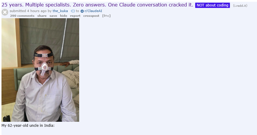 Conversing with LLMs helped me enormously with what turned out to be post-viral fatigue.I had noticed a few things, some exercise I could do, some things that would put me on my ass for a week. Some symptoms. Plugged it all into a conversation with Grok and it gives me a few things to try. Antihistamines daily, huge improvement. Creatine daily. Night and day difference to my fatigue. It even explained why some exercises were fine (reclined position) verses not (upright position) and it being due to post-viral autonomic dysregulation.Genuinely improved my quality of living and I had been dealing with that shit for several years.
