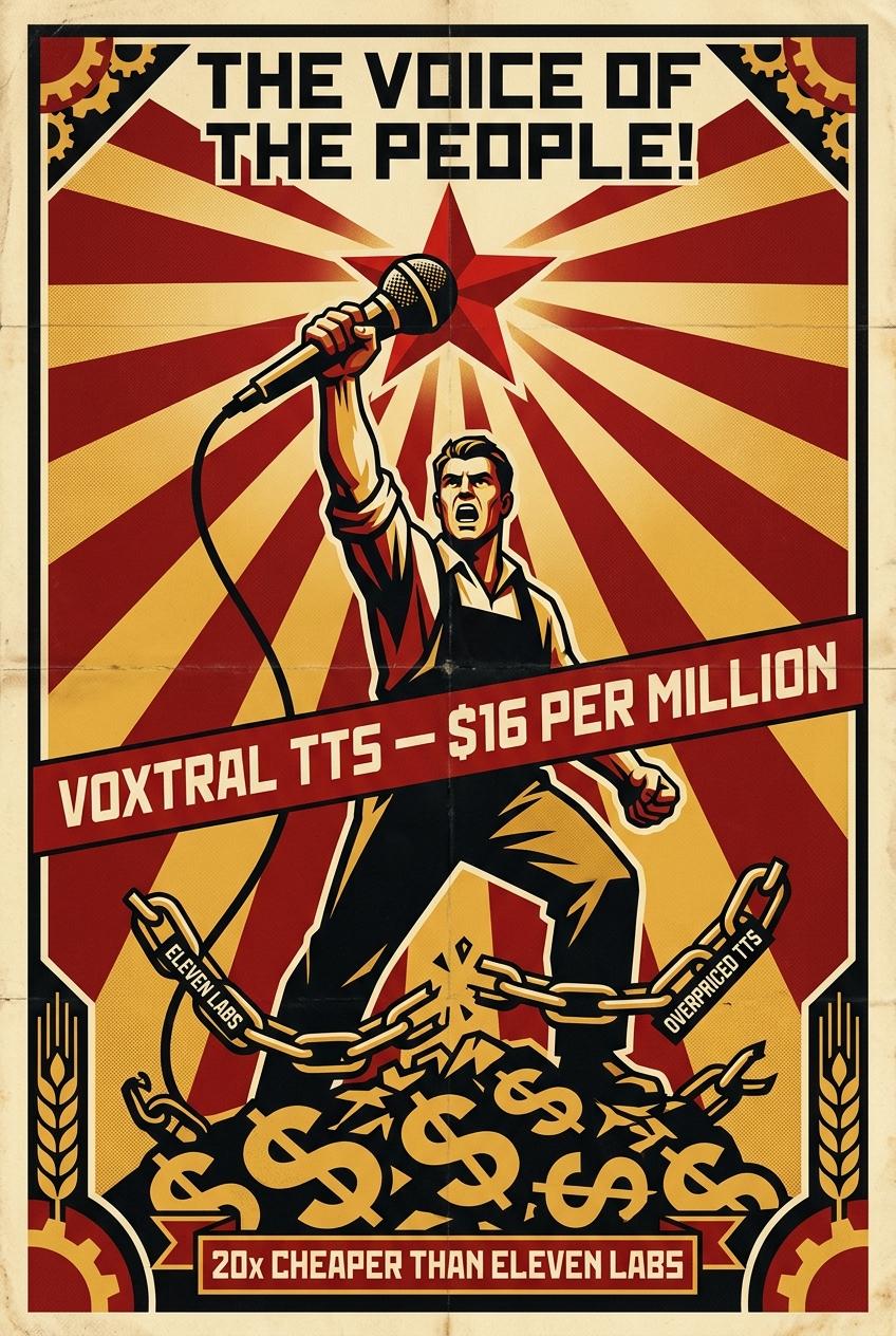 https://venturebeat.com/orchestration/mistral-ai-just-released-a-text-to-speech-model-it-says-beats-elevenlabs-and> "We see audio as a big bet and as a critical and maybe the only future interface with all the AI models," Pierre Stock, Mistral's vice president of science and the first employee hired at the company, said in an exclusive interview with VentureBeat. "This is something customers have been asking for."[...]> "It's a 3B model, so it can basically run on any laptop or any smartphone," Stock told VentureBeat. "If you quantize it to infer, it's actually three gigabytes of RAM. And you can run it on super old chips — it's still going to be real time.">> The model supports nine languages — English, French, German, Spanish, Dutch, Portuguese, Italian, Hindi, and Arabic — and can adapt to a custom voice with as little as five seconds of reference audio. Perhaps more remarkably, it demonstrates zero-shot cross-lingual voice adaptation without explicit training for that task.[...]> Mistral's decision to release Voxtral TTS with open weights is consistent with a movement that has been gathering momentum across the AI industry. At Nvidia GTC earlier this month, Nvidia CEO Jensen Huang declared that "proprietary versus open is not a thing — it's proprietary and open." Nvidia announced the Nemotron Coalition, a first-of-its-kind collaboration of model builders working to advance open frontier-level foundation models, with Mistral as a founding member.>>>> The first project from that coalition will be a base model codeveloped by Mistral AI and Nvidia.> The first project from that coalition will be a base model codeveloped by Mistral AI and Nvidia.> The first project from that coalition will be a base model codeveloped by Mistral AI and Nvidia.