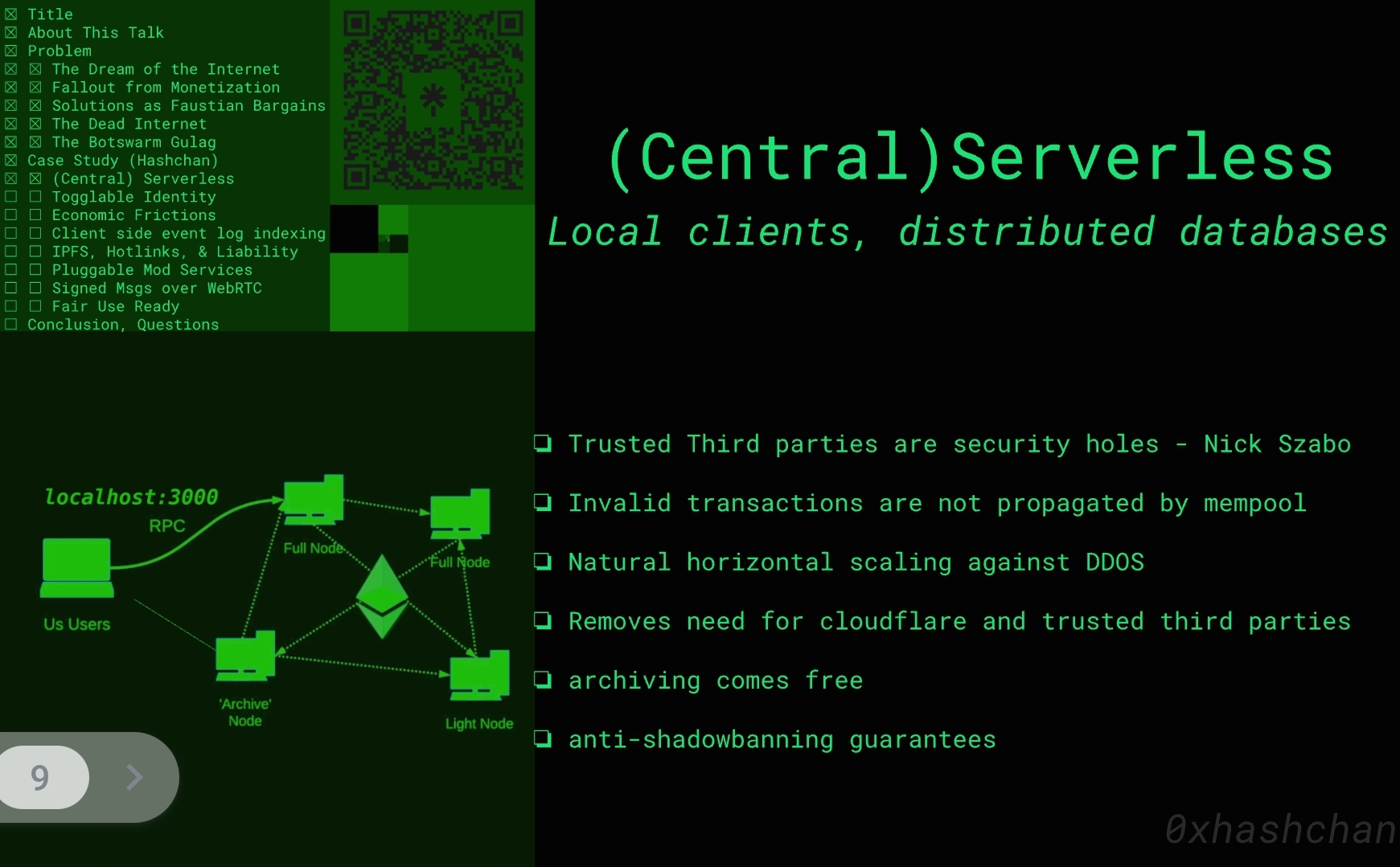 >>108464668A main design intent is to make it explicitly not a platform for entity for something like ofcom to target. Theres no legal entity for haschan, no corporate structure, the code is use however you want liscence, no money/donations changing hands, No dns record is required, no ad space rented. Its a pure code as speech play under the suspicions this could go the way of tornado cash in 5 years and the more the walk away test passes the better- it needs things like mixers anyways, which should be recaptured if things go as planned.A nice bonus of this is getting to just take a pure vision- beacons of minas tirith approach and not worry about cash flow and prod market fit- a json rpc issue is user space as it deserves to be