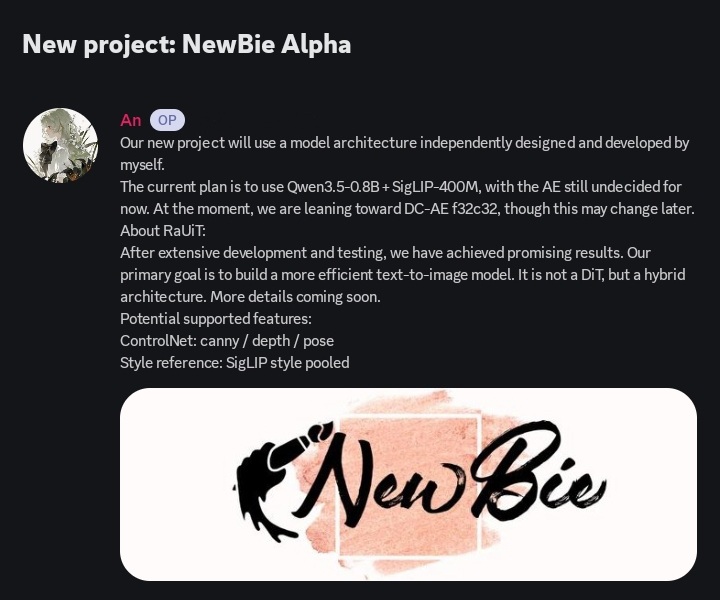 Babe babe wake up! NewBie Alpha just released, well, not yet, but soon™!Info:Qwen3.5-0.8B + SigLIP-400M backbone (+0.2B than Anima)RaUiT architecture (hybrid, NOT DiT slop)Potentialy:ControlNet: canny depth pose