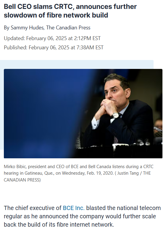 If you live in Ontario or Quebec in non-rural area (i.e. ineligible for government fibre gibs) and you don't already have fibre, you're not going to get fibre for a long, long time. The incumbent Bell Canada threw a fit and stopped FTTH rollout because the federal government told them they have to allow access to the fibre lines at 85% of the retail price (this wouldn't let the competitor undercut Bell but would allow them to sell at almost the same price - this was done to prevent Bell from gaining advantage by bundling fibre internet with wireless phones and TV).Bell's FTTH footprint is really weird outside of Toronto because they prioritized cities served by Cogeco, the smallest of the national cable companies, to drain Cogeco's finances (they'd have to upgrade to DOCSIS 4.0 to match the speed) and delay Cogeco's entry into the wireless market. The result is that Bell has near 100% coverage in declining towns full of old peole like Bellville but less than 10% coverage in cities full of tech workers like Waterloo.The only exception from this menace is London and Kitchener where Telus is rolling out FTTH in the Bell telephone territory to fuck with Bell.