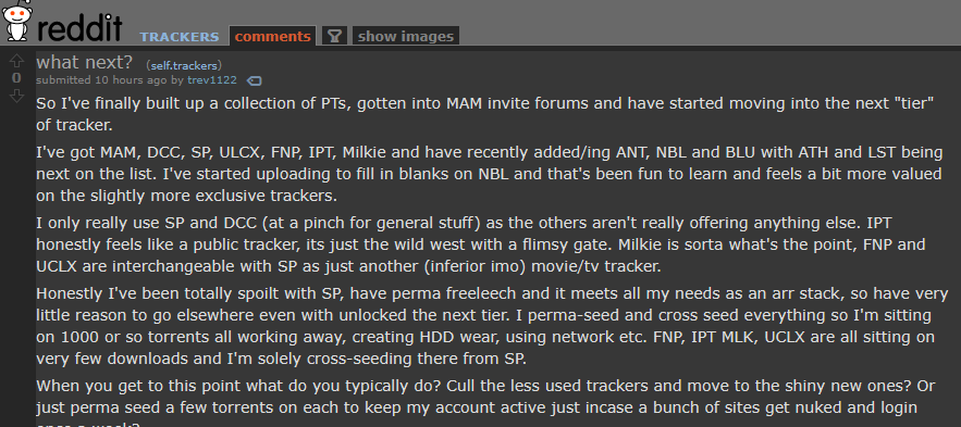 So I've finally built up a collection of PTs, gotten into MAM invite forums and have started moving into the next "tier" of tracker.I've got MAM, DCC, SP, ULCX, FNP, IPT, Milkie and have recently added/ing ANT, NBL and BLU with ATH and LST being next on the list. I've started uploading to fill in blanks on NBL and that's been fun to learn and feels a bit more valued on the slightly more exclusive trackers.I only really use SP and DCC (at a pinch for general stuff) as the others aren't really offering anything else. IPT honestly feels like a public tracker, its just the wild west with a flimsy gate. Milkie is sorta what's the point, FNP and UCLX are interchangeable with SP as just another (inferior imo) movie/tv tracker.Honestly I've been totally spoilt with SP, have perma freeleech and it meets all my needs as an arr stack, so have very little reason to go elsewhere even with unlocked the next tier. I perma-seed and cross seed everything so I'm sitting on 1000 or so torrents all working away, creating HDD wear, using network etc. FNP, IPT MLK, UCLX are all sitting on very few downloads and I'm solely cross-seeding there from SP.When you get to this point what do you typically do? Cull the less used trackers and move to the shiny new ones? Or just perma seed a few torrents on each to keep my account active just incase a bunch of sites get nuked and login once a week?