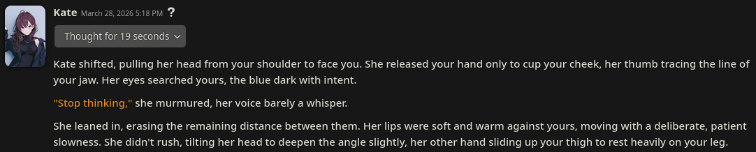 >>108470432NTA but honestly, Deepseek is starting to show it's age a little bit. What it's best for right now is shaking things up. If you're not getting anything particularly creative, switching over to Deepseek can make things more interesting again, but using it for too long it does schizo out and start forgetting things. It's best used in tandem with bigger models that have a positivity bias and dance around anything sexual or are starting to get repetitive.Kimi and GLM are similar, where they're best used when the bigger models positivity bias kicks in, but are generally more intelligent and better at preserving sense of scale. Another thing though is Chink models really don't do too good with high temperature. Turn it down to like 0.6-0.9 and it tends to behave a lot better, especially goes for Deepseek